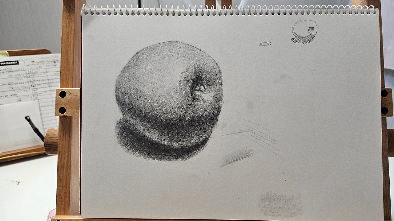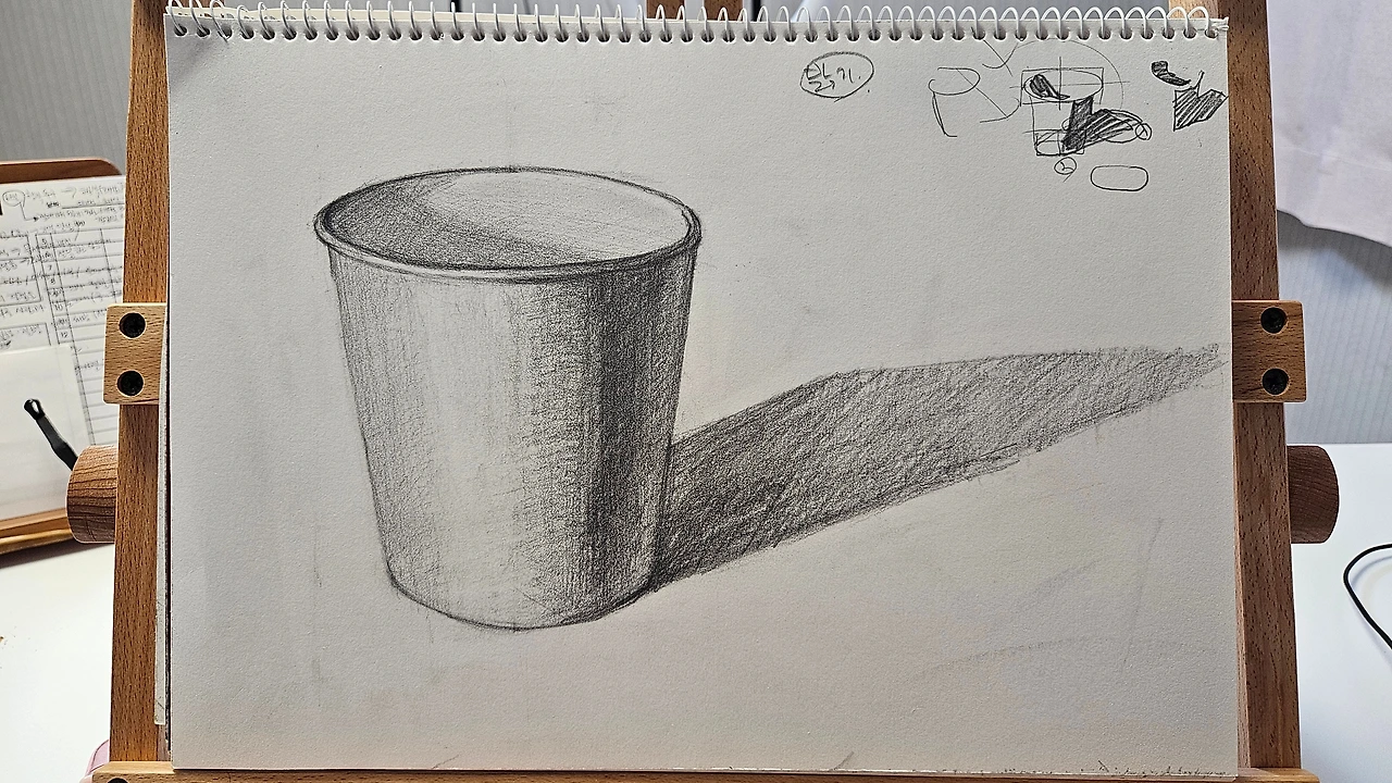 둘째부터 다섯째 주, 도형을 따라 그리기 시작했다. 정육면체, 종이컵, 원, 사과, 원기둥 사진을 따라 그리며 나는 사물을 제대로 관찰해 본 적이 없다는 사실을 깨달았다. 연필과 눈대중을 사용해 사물의 가로 세로 비율을 체크하고밑그림을 그리는데 그 비율을 가늠하는 것이 쉽지 않았다.