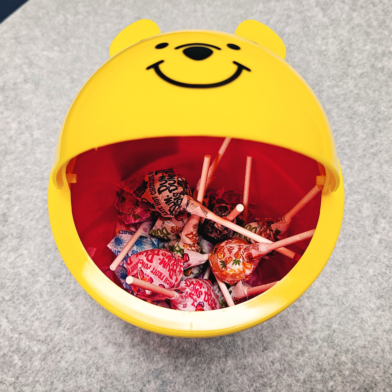 3단계 다양한 먹거리, 그냥 달랑 사탕 한 개만 주면 안 된다. 무조건 귀여운 상자나 통에 다양한 종류의 선택지를 넣어와야 한다. 의사 선생님 필살기 사탕통은 책상용 푸우 휴지통, 그 안에는 대여섯 개의 다른 맛 막대사탕이 들어있다. 우선 선택을 하게 만들고 바로 까서 입에 넣어준다. 그 후 다시 귀를 들여다보면 99%는 보여준다. 우리 실비아를 제외하면 말이다.