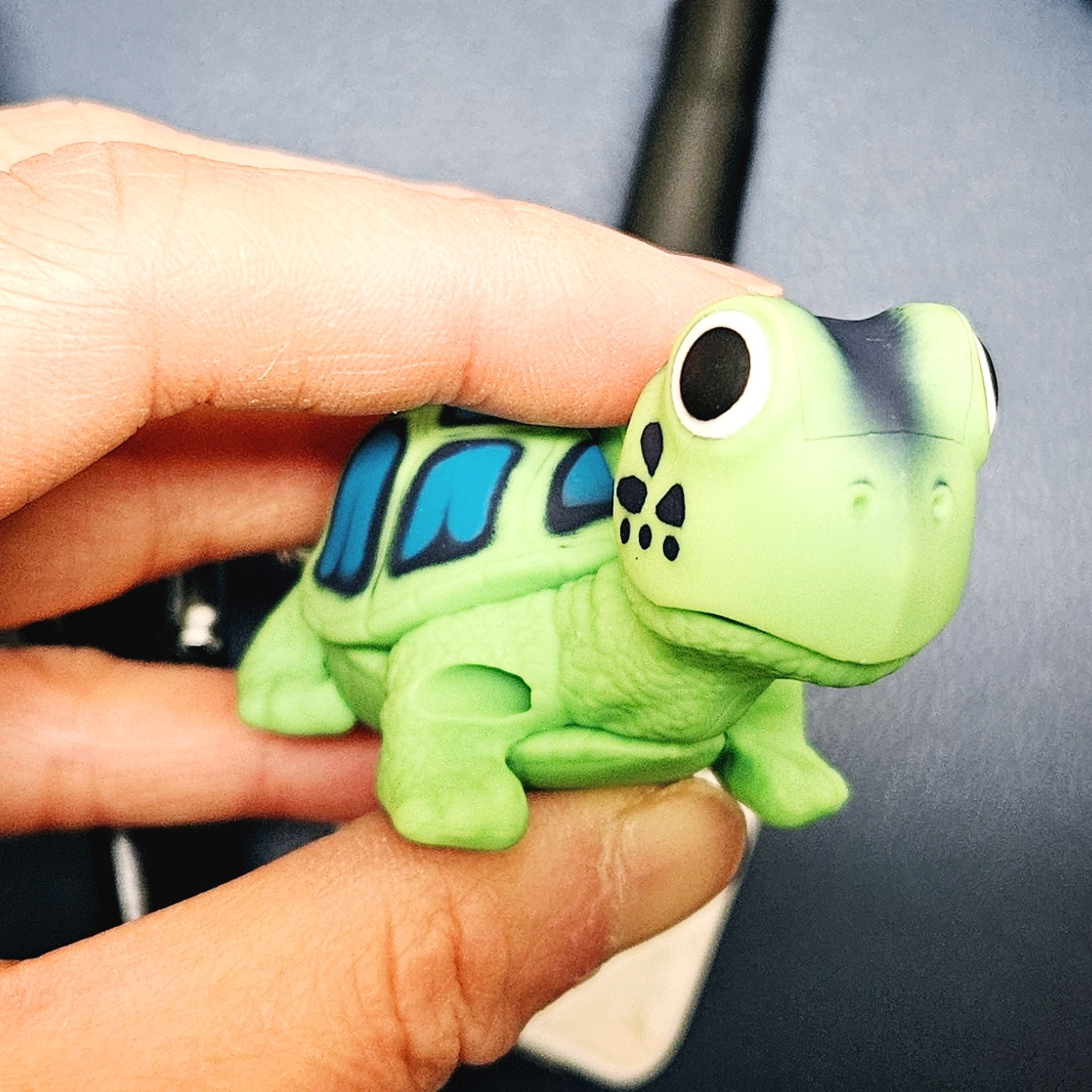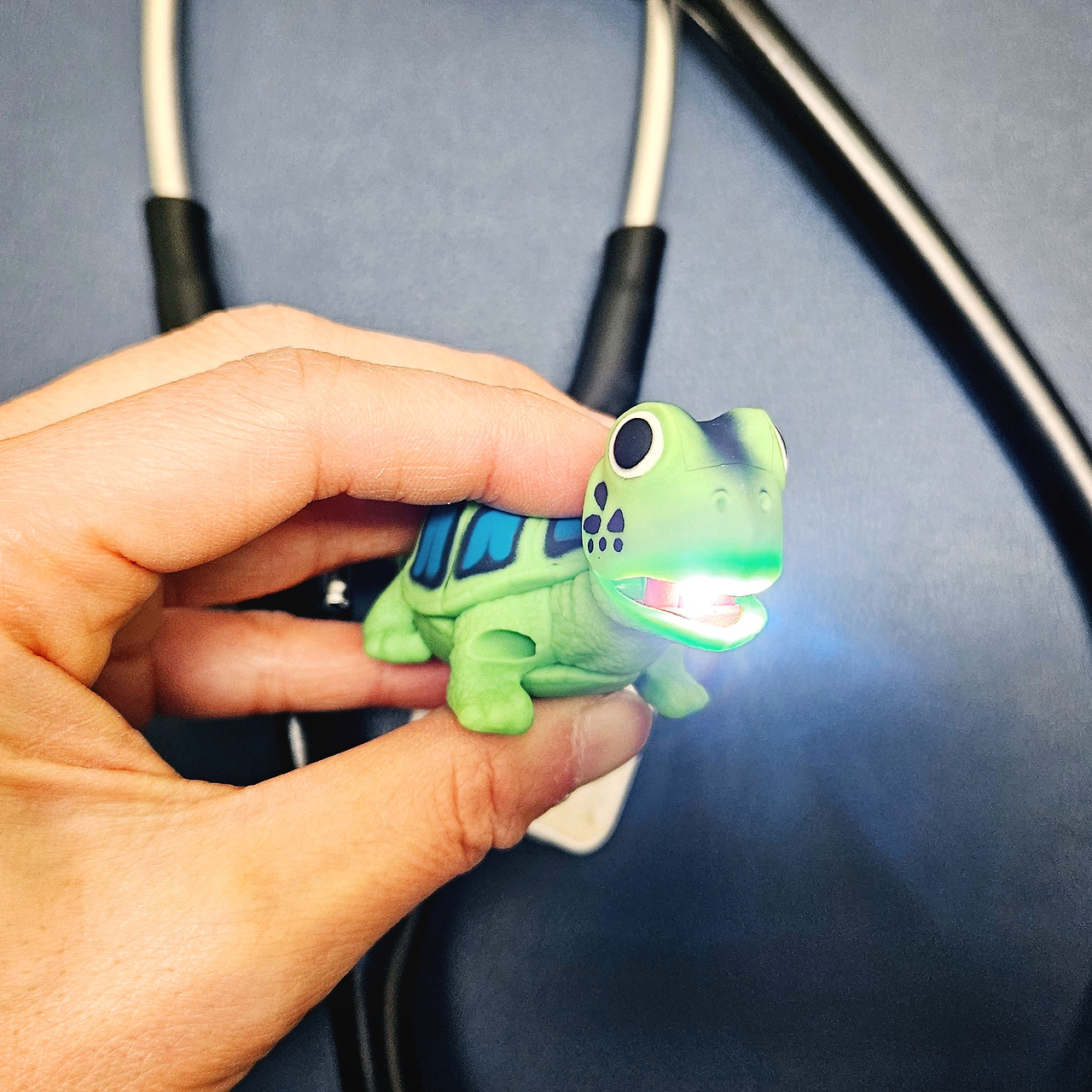1단계 라포형성, 의사 선생님의 무기는 청진기에 달린 신기한 라이트다. 거북이 모양으로 버튼을 누르면 입이 열리며 불빛이 나온다. 1단계서 웬만한 아이들은 울음을 그치고 거북이 삼매경에 빠진다. 딸깍딸깍 버튼을 누르며 주의가 분산될 때 온몸을 체크한다. 하지만 실비아에게는 실패! 거북이가 실패하면 그다음은,