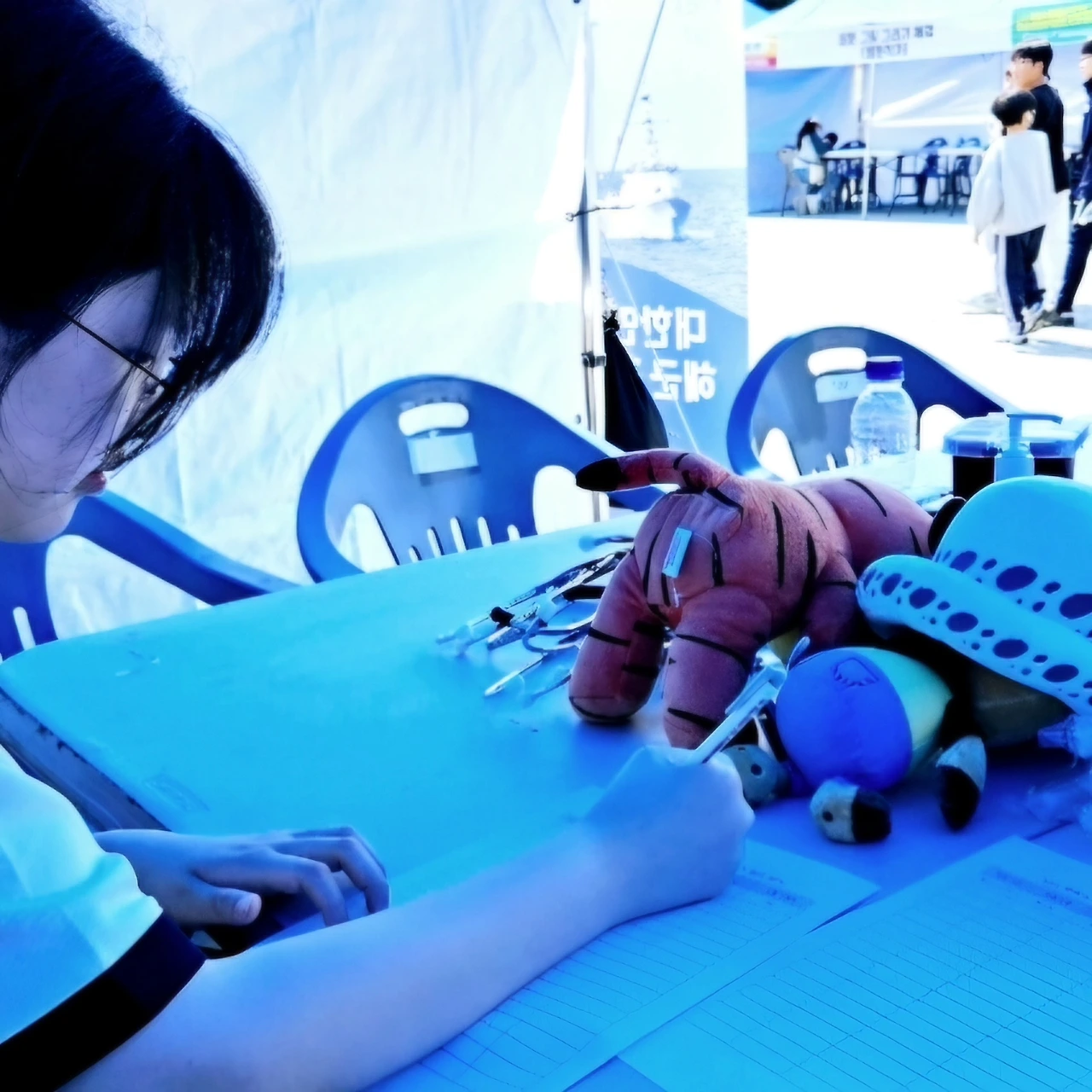 가져간 물품들을 세팅하고 주변을 살폈다. '또 나만 혼자네', 옆에는 4명의 해군 군인들이 팸플릿까지 준비해 지나가는 아이들의 시선을 끌었다. 내 앞 방송댄스 부스에는 시작도 전부터 신나는 댄스시범이 이어졌다. 철저히 혼자인 나는 최대한 불쌍하게 지나가는 아이들을 쳐다봤다. '이래도 안 올래?' 그렇다면내 필살기는 주사실습이다. 아이들의 눈에 띄는 곳에 엉덩이를 대줄 인형을 배치시켰다.