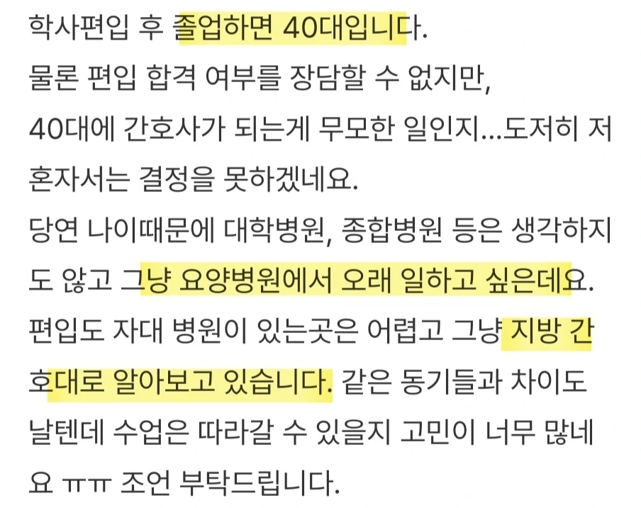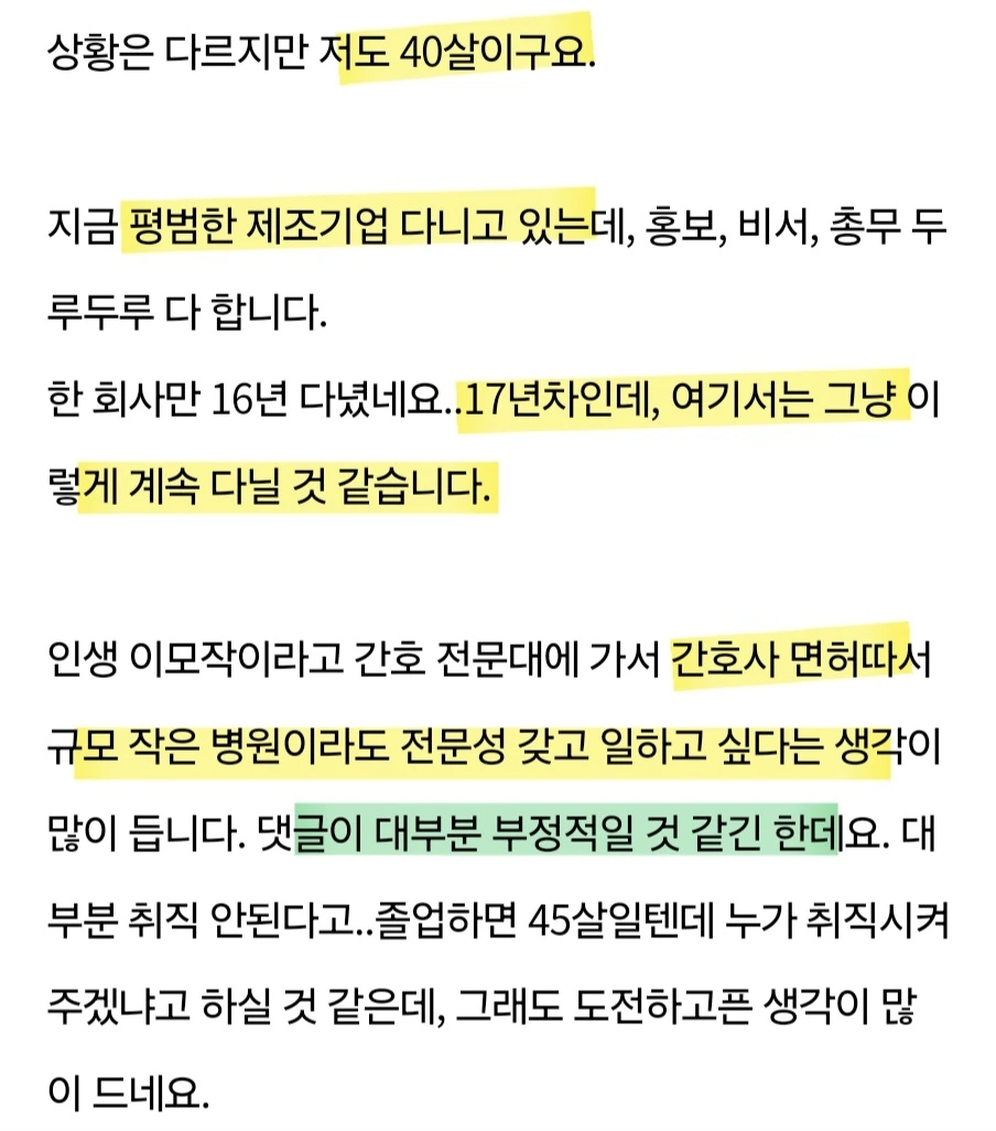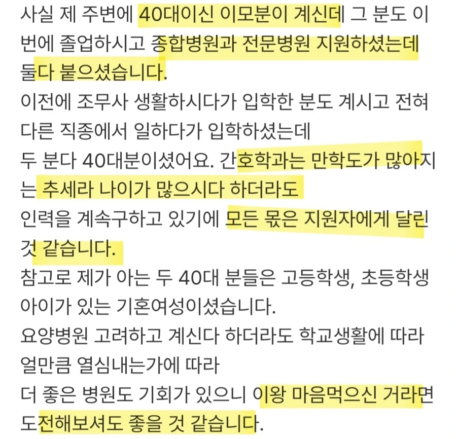 대한간호협회에 따르면 2020년 말 현재 전국 의료기관에 근무하는 간호사 21만 6408명 가운데 40세 이상은 7만 1662명(33.11%), 39세 이하 간호사는 14만 4746명(66.89%)으로 나타났다. 특히 50대 이상 간호사의 증가율은 평균 27.15%로, 전체 간호사 증가율 13.25%보다 2배 높았으며 2년 새 70세 이상은 169명이 늘어 75.79% 증가했다. 60대 증가율은 31.20%로 1289명, 50대는 4667명이 늘어 25.64%의 증가율을 보였다고 전했다.