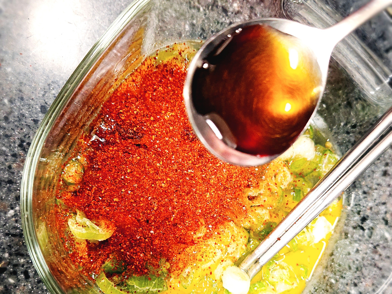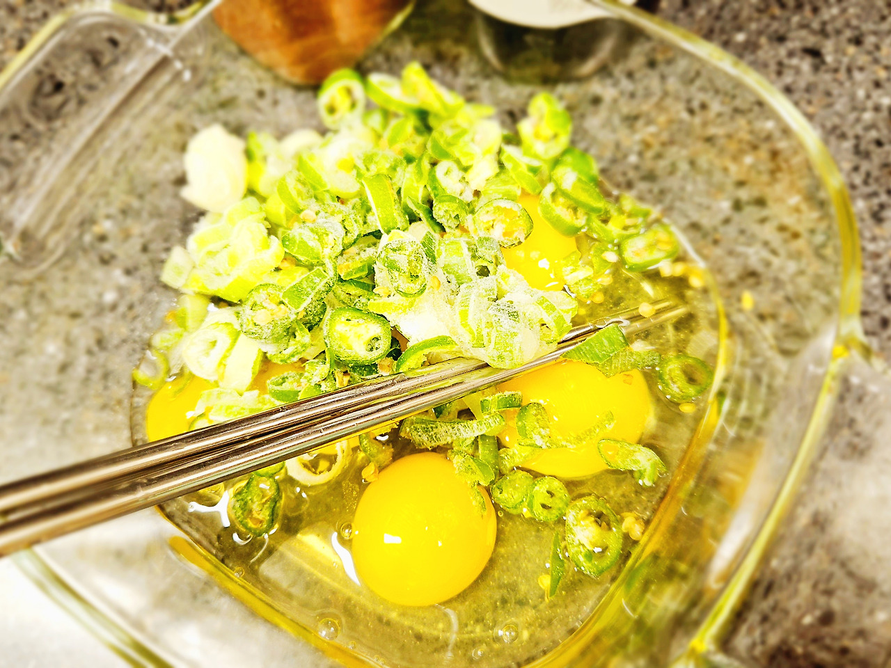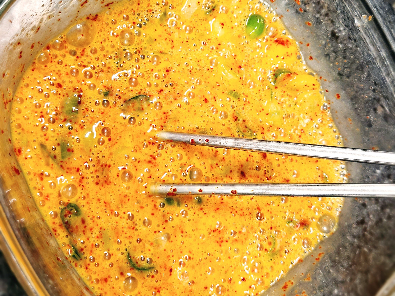 사실 만드는 방법은 요리라고 하기 민망할 정도로 간단하다. 계란 3~4알을 깨 넣고 파, 청양고추, 고춧가루를 집어넣는다. 매운맛을 좋아하는 나는 '때려 붓는다'라는 표현이 어울릴 정도로 청양고추와 고춧가루를 추가한다.