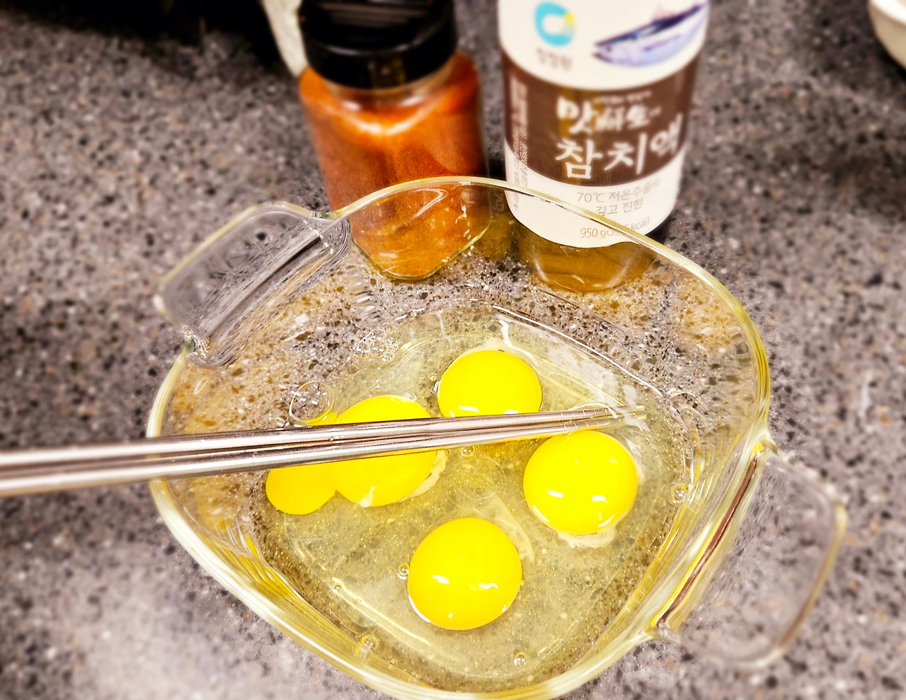 마지막에 참치액젓을 한 스푼 두르고 골고루 섞이게 저어준 후 프라이팬에 붓는다. 브런치로 먹는 스크램블에 들어가는 버터나 부침 요리에 사용하는 식용유 없이 달걀물 그대로 프라이팬에 조리한다. 버터나 기름을 두르지 않아도 프라이팬에 계란이 달라붙지 않기 때문에 굳이 기름은 사용하지 않는다.