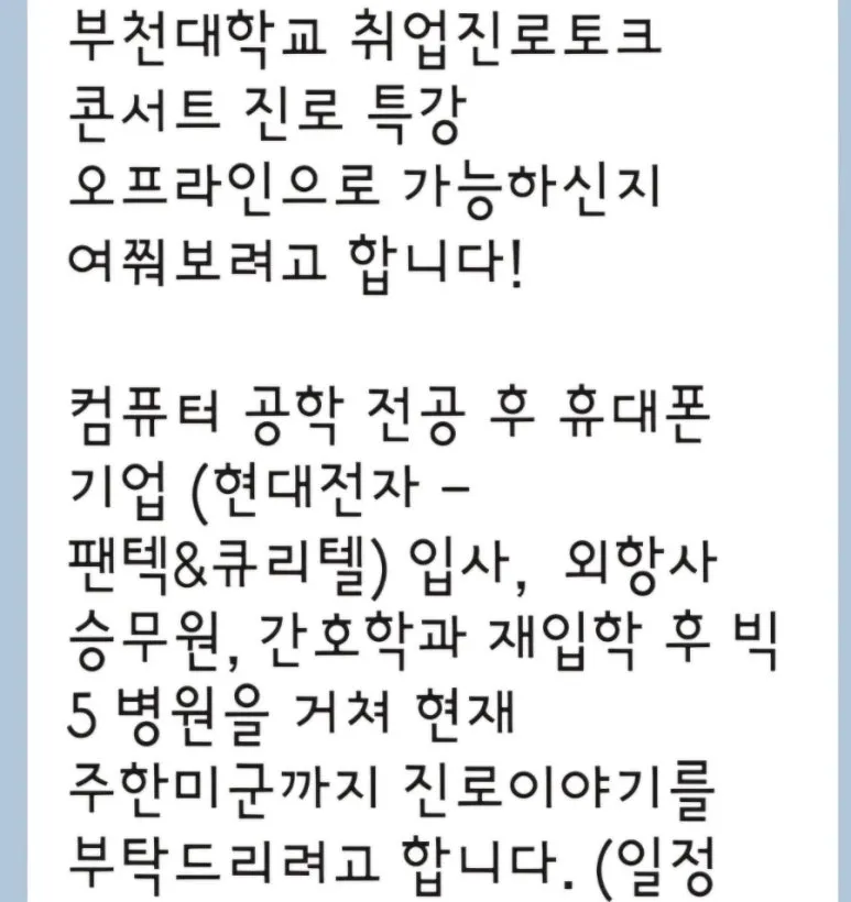 매해 잊지 않고 대학 강의를 맡겨주시는 한매니저님이 얼마 전 부천대학교 진로 강의를 제안 주셨다. 그런데 이번 강의는 제안하신 내용만으로도 설렘과 동시에 긴장이 느껴지는 특별함이 있었다.