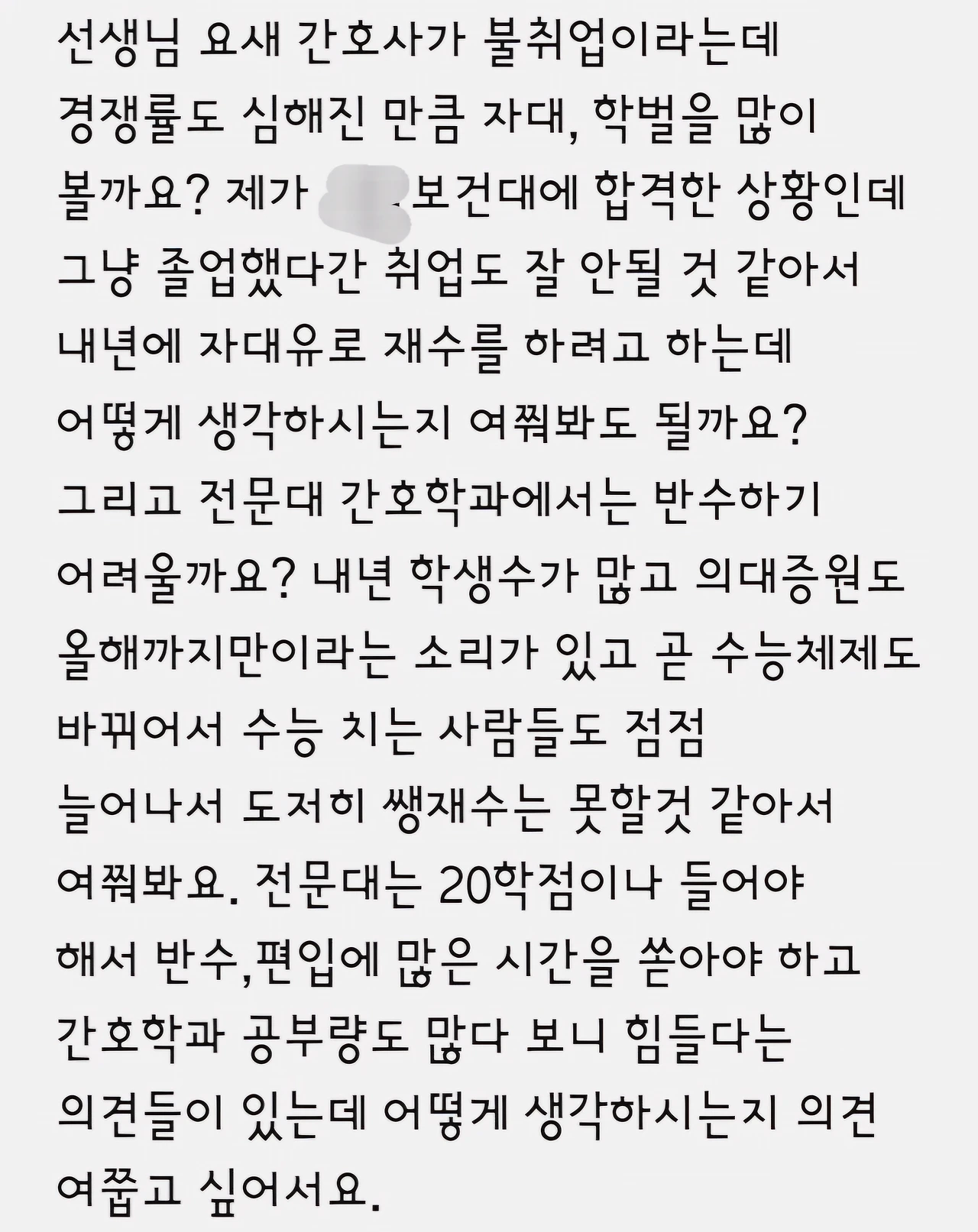 간호사 취업란이 난리도 아니다. 힘들어도 취업하나 잘된다는 이야기에 간호학과에 들어간 많은 학생들이, 장기화된 의료파업으로 생긴 불취업 때문에 불안에 떨고 있다. 그래서인지 요새 부쩍 학교 선택에 대한 이야기를 물어오는 댓글이 늘었다. 재수, 반수를 고민하는 구독자의 댓글과 내가 실제로 대답한 내용은 아래와 같다.