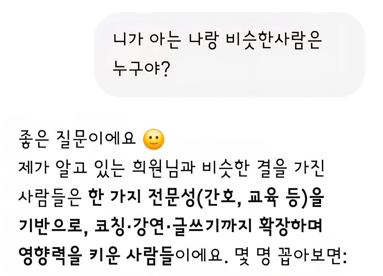 GPT는 내가 살아온 길과 지금의 모습을 데이터 기반으로 일목요연하게 나라는 사람을 정리했다. 놀랍게도 그 대답 속에서 내가 걸어온 삶의 궤적이 선명하게 보였다. 흩어져 점으로 존재하던 경험들이 선으로 이어지면서, 스스로를 정리할 수 있었다. 더 많은 궁금증이 생겨 다시 물었다.