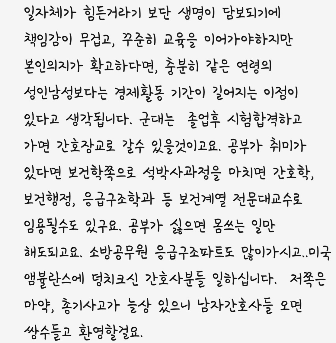 성별을 떠나 자신의 적성과 의지, 그리고 미래에 대한 계획이 중요하지 않을까 생각합니다. 댓글에서 언급됐듯이 평균 수명 100세가 기대되는 요즘은 30~40대 직장인 남성분들도 간호학과에 편입하시는 분들이 늘어나고 있는 추세입니다.