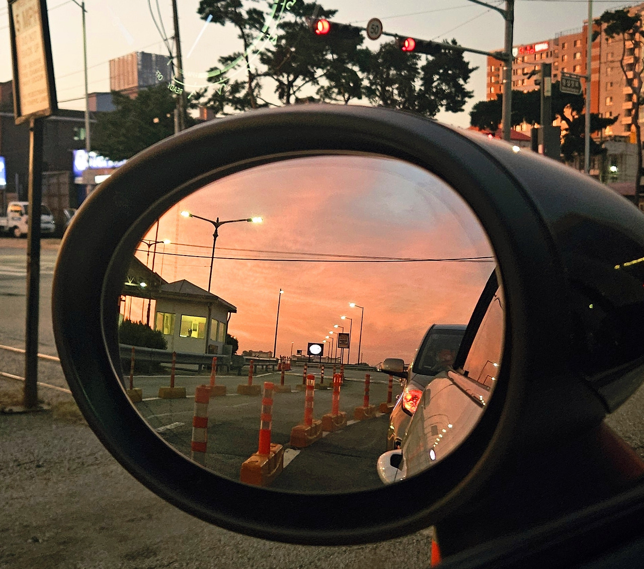 그 빛은 인간이 아무리 정교한 물감을 섞어도 흉내 낼 수 없는 색이었다. 붉음과 보랏빛이 겹겹이 번져, 사라지기 전 마지막 힘을 다해 하늘을 물들이는 듯했다. 마침 신호가 걸려 차를 멈출 수 있었고, 나는 핸드폰을 들어 서둘러 그 순간을 담았다.
