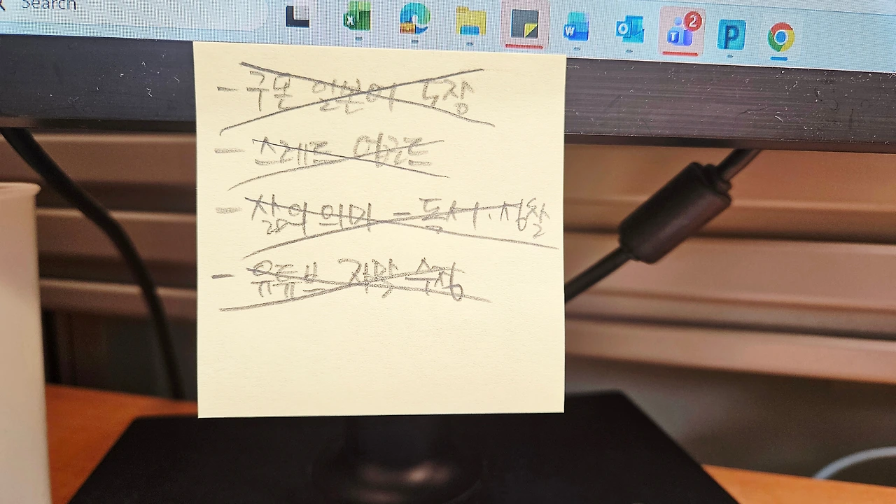 포스트잇은 반드시 내가 가장 오래 머무는 공간, 가장 자주 보는 곳에 붙인다. 나는 컴퓨터 모니터 아래, 눈에 가장 잘 들어오는 자리에 붙여둔다. 이 단순한 시각 자극의 효과는 생각보다 강력하다.