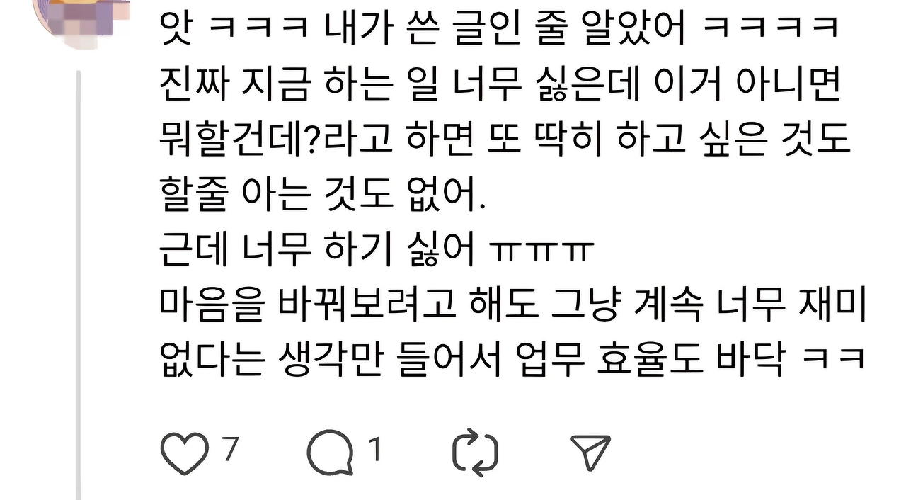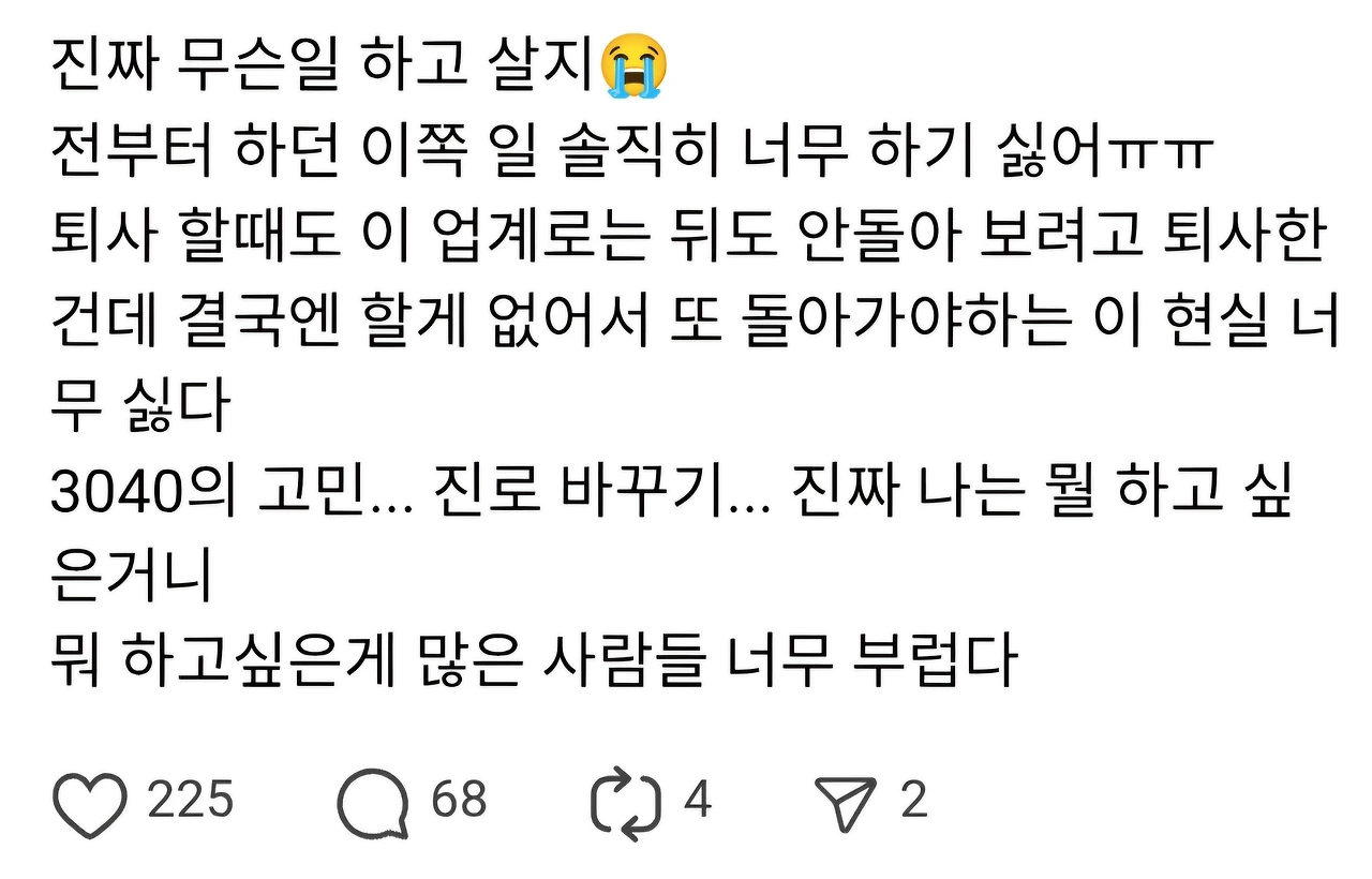 요즘 스레드에는 “지금 하는 일이 너무 싫은데 이것 말고는 할 줄 아는 게 없다”, “20년 차인데 갈 곳이 없다”는 고백들이 수시로 올라온다.