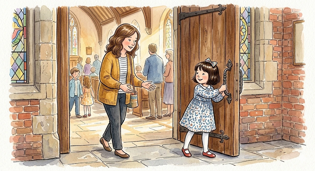 주일 미사를 보러 성당에 갔다. 대성전으로 들어가려는데, 내 바로 앞에 초등학교 1학년도 안 되어 보이는 여자아이가 딱 한 발 앞서 걷고 있었다. 당연히 그 아이가 문을 열고 쏙 들어가겠거니 생각하며, 뒤따라 문을 밀기 위해 손을 뻗었다.