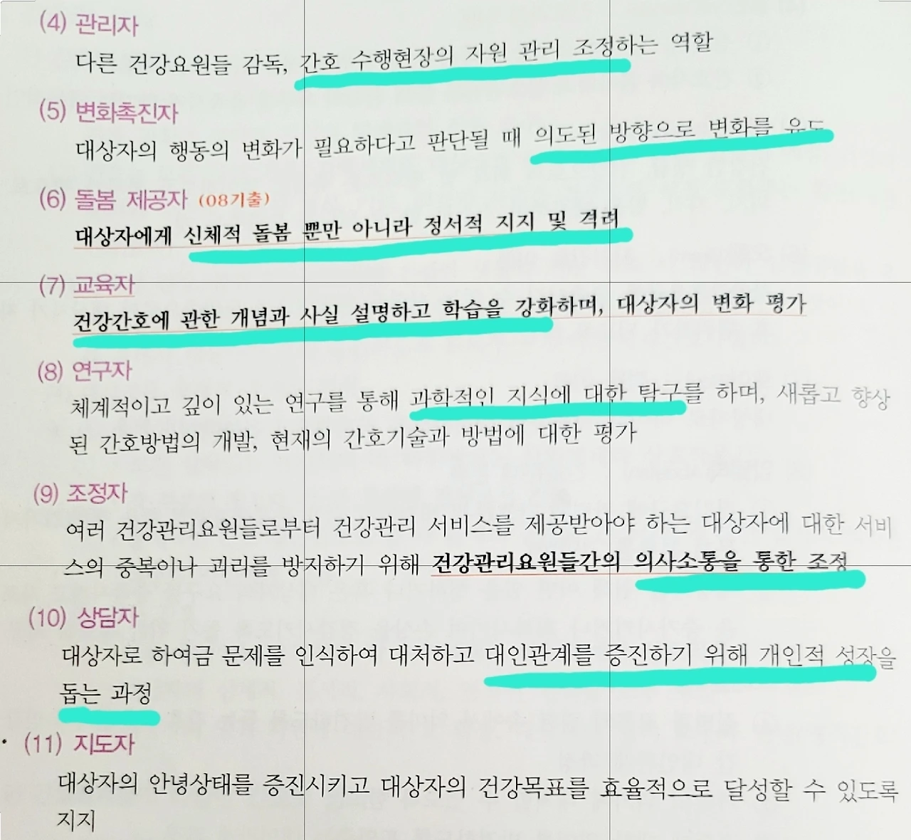 교과서에 정의된 간호사의 일반적 역할은 다음과 같다. 간호 제공자, 의사소통자, 옹호자, 관리자, 변화촉진자, 돌봄 제공자, 교육자, 연구자, 조정자, 상담자, 지도자.