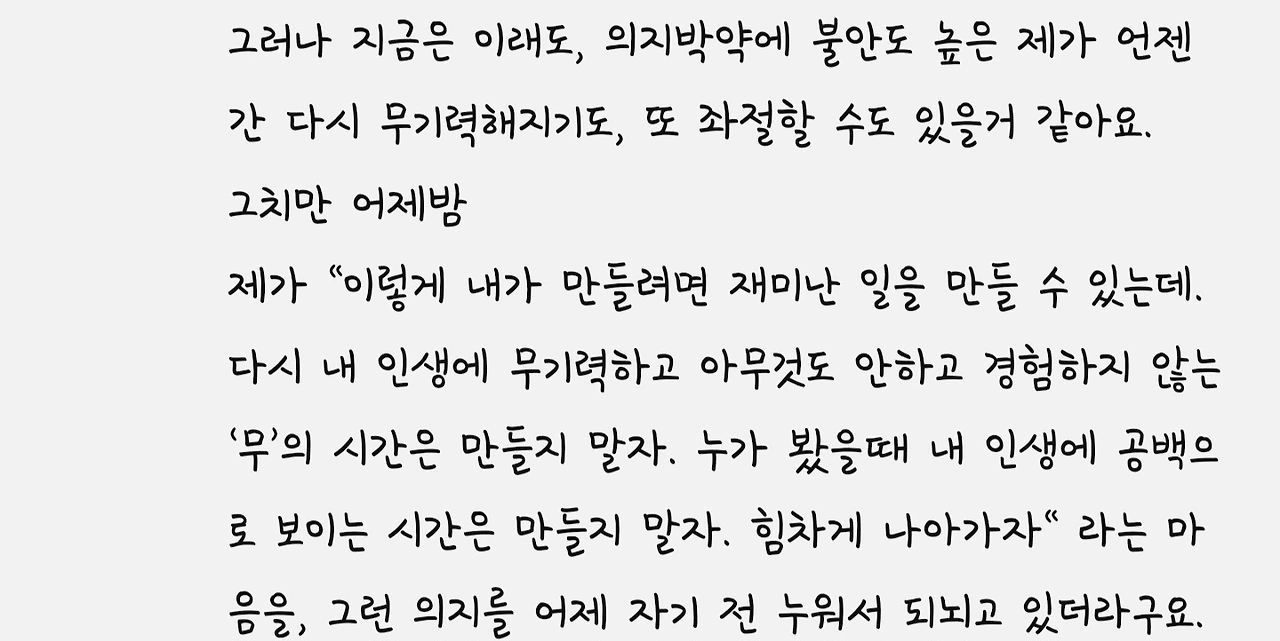 남들이 '좋아하는 일을 해야 된다'라고 하니까 조급하게 찾다가 답이 안 나오면, 되려 무기력해지기도 한다. 고민한다고 하루 이틀 내에 뚝딱 찾아지는 것도 아니고, 그러다 보면 또 자신이 한심해지고 무기력해지기를 반복하는 것이다.