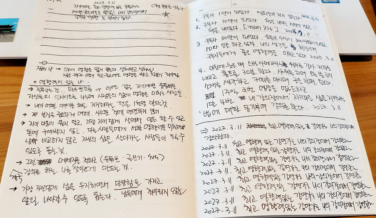 뻔하게 알고 있는 이야기라 듣다 말았던 영상을 다시 봤다. 지금의 내가 '에이, 이걸 내가 어떻게 해낼 수 있겠어?' 하고 잠시 스쳐 지나갔던 생각을 끄집어내 디테일하게 구체화시켰다.