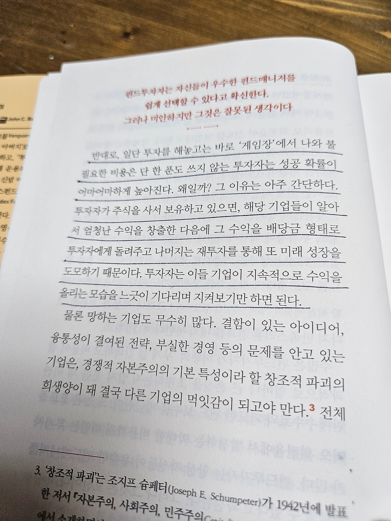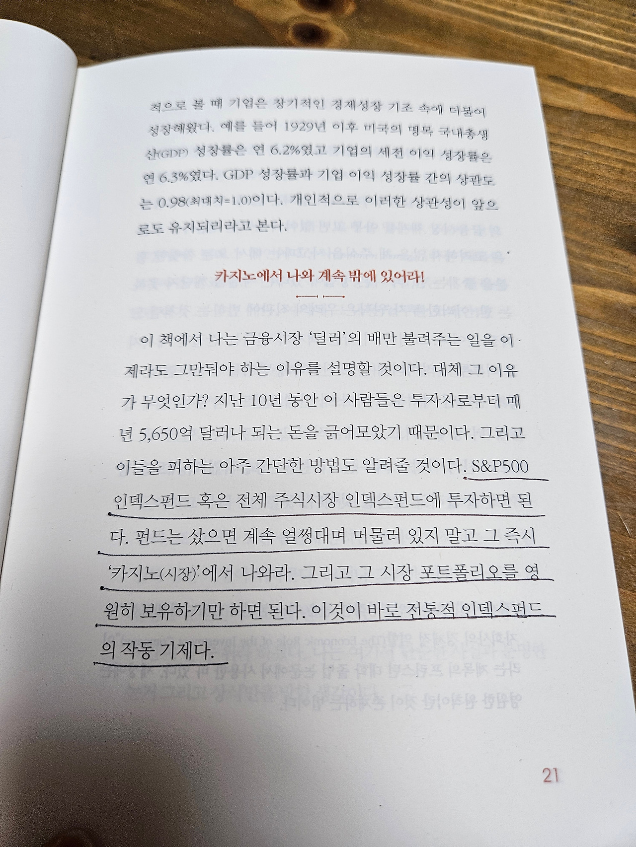 내가 이 책을 읽고 밑줄을 그은 부분이다. 역시 고전이다 보니 최근에 쓰인 책의 내용이 많이 보인다. 모든 주식을 소유하는 것은 시장 전체를 가지라는 말이다. 위험 부담이 적고 결국에는 이기는 싸움을 하는 것이다.