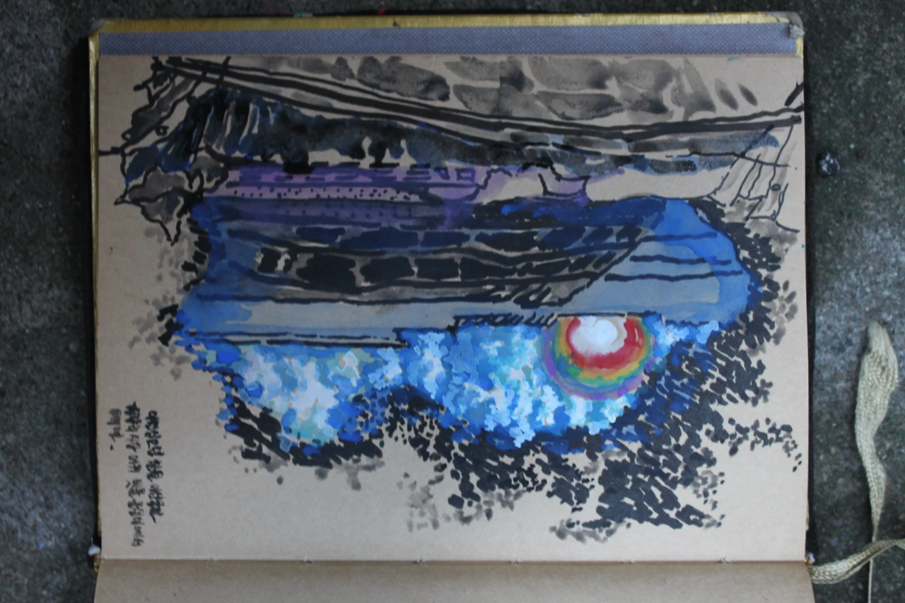 어? 물웅덩이에는 해 주변으로 무지개가 있는데 하늘의 해는 무지개가 없다.