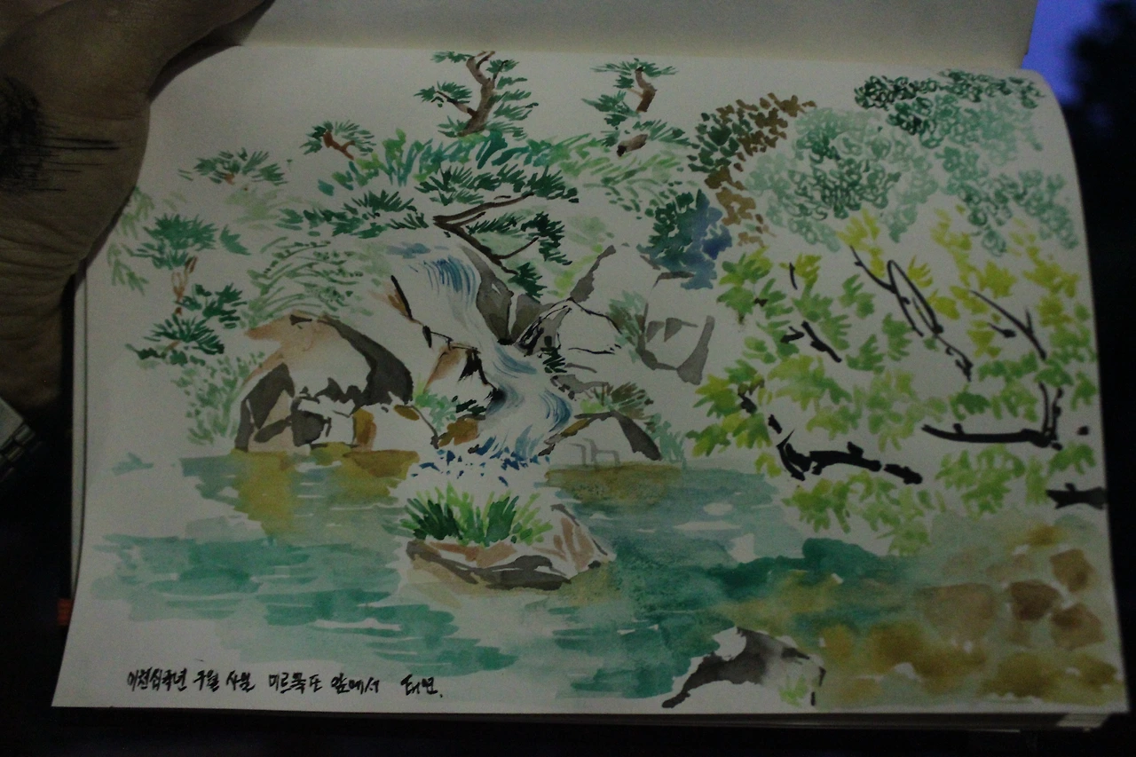 하지만 나름 도심 속 한가운데 계곡이란 느낌이 신선하기도 하고 해서 그림을 그리려 물감을 펼친다.