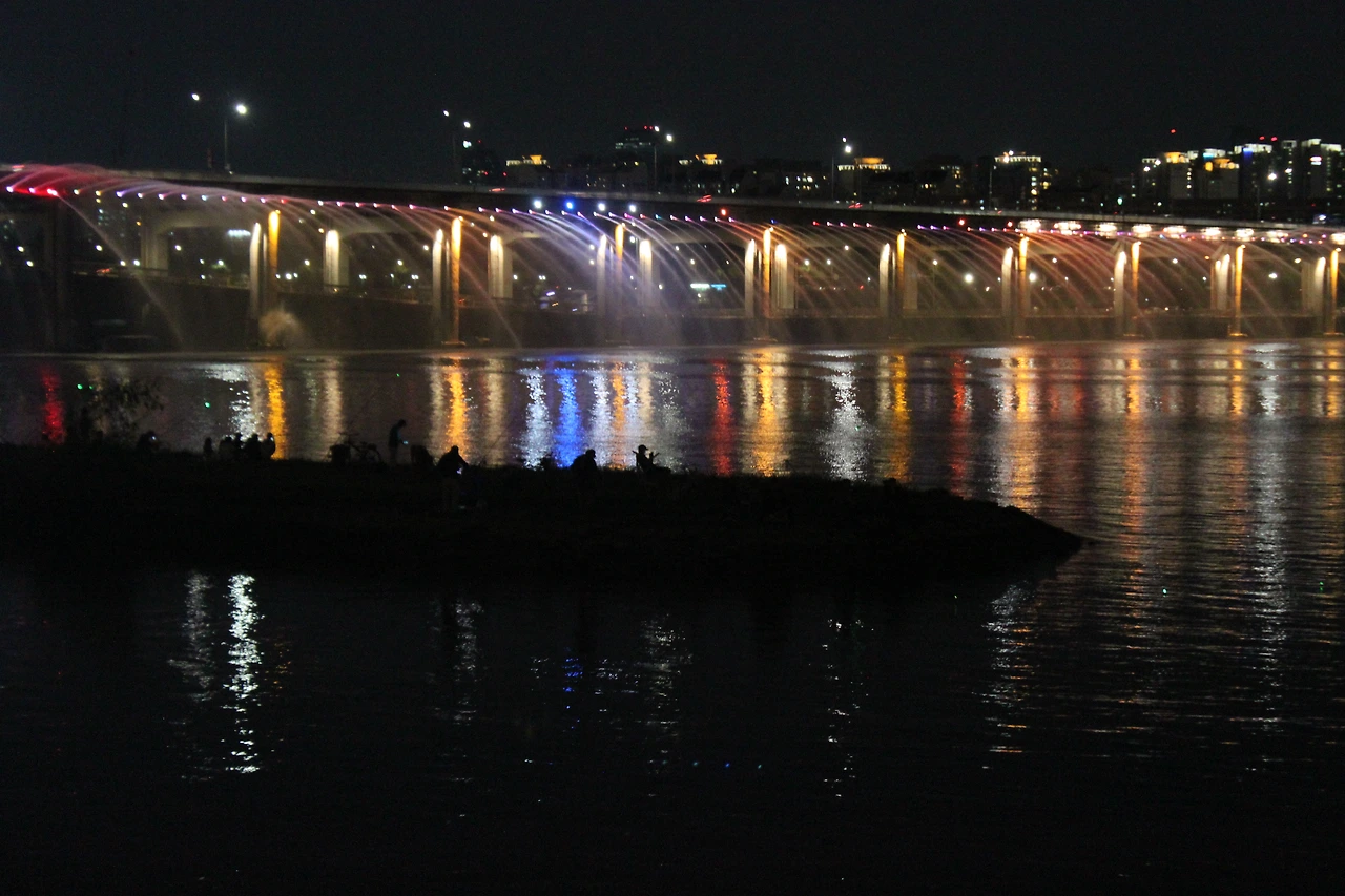 유람선이 지나가고 반포대교에서 분수 물이 내린다.