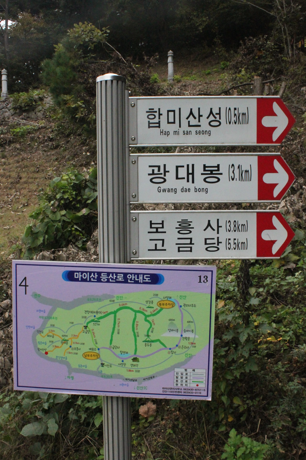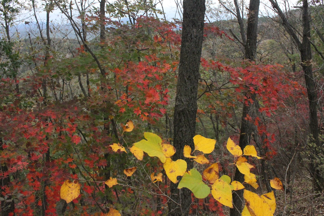 10시경 '진안'에 도착해서 산행의 시작은 '합미산성'이 있는 무덤가에서 시작한다. 아직 밑에 지방은 푸릇함이 더 우세하였으나 올라가면 갈수록 계절은 더욱 색이 농염하게 짙어진다. 자연의 색은 이리도 화려하고 아름다웠나 싶을 정도로 수십수백 가지 물감을 물에 타 뿌린 것처럼 다양한 색의 잔치가 열린 듯하다.