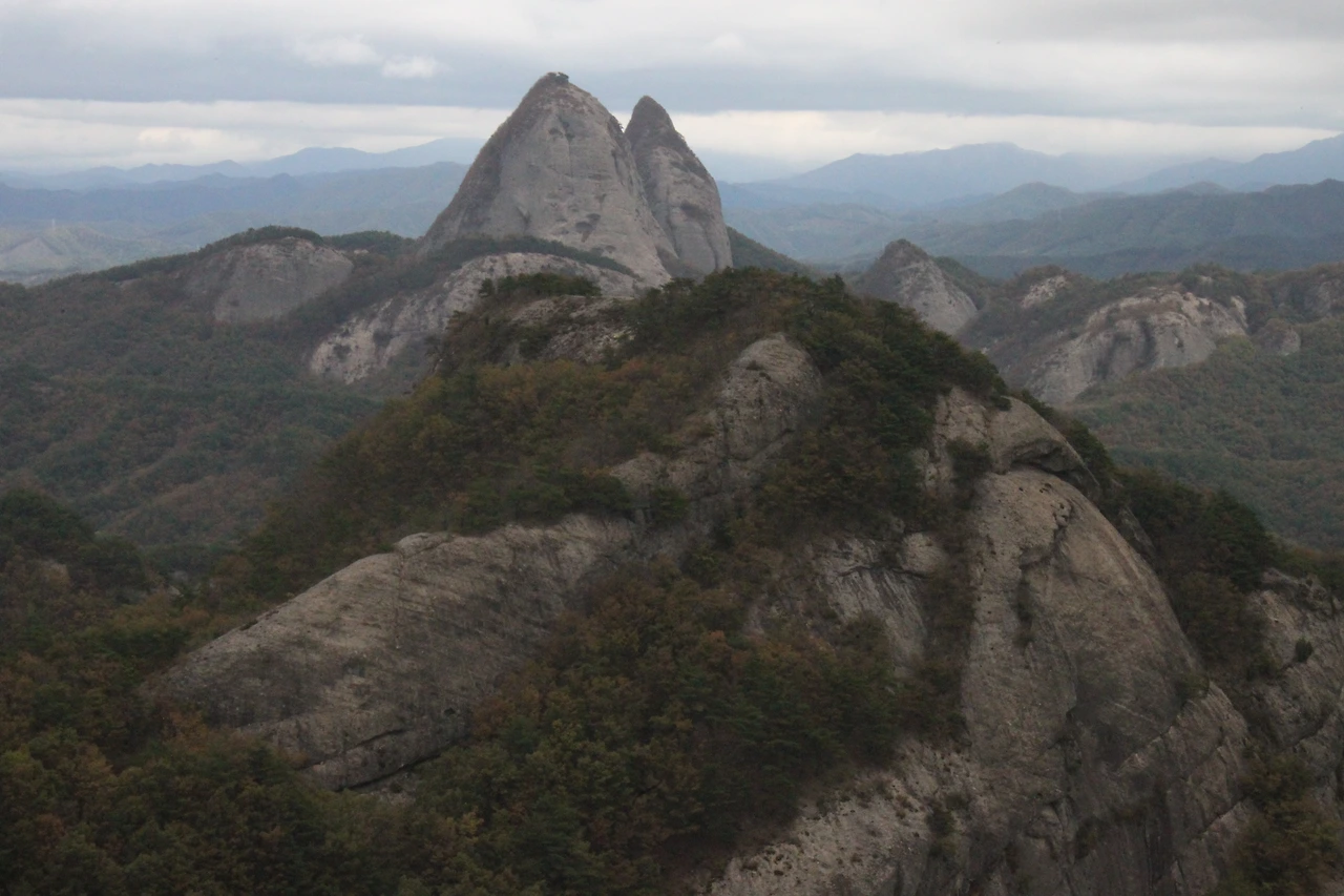 이쪽 방향에서 가니 두 봉우리가 옆에서 겹쳐져 하나처럼 보인다. 모든 인생의 경험들은 다양한 각도와 방향에서 생각되고 판단되어야 한다. 오늘 내가 가는 각도의 길은 숫마이봉이 주인공이 되는 길이다. 그래서 그런지 숫마이봉의 잘난 체하는 모습이 그리 싫지만은 않다. 하지만 저 멀리 그곳까지의 거리가 결코 가깝지 않기에 사과를 한입 베어 물고 서둘러 능선을 따라간다.