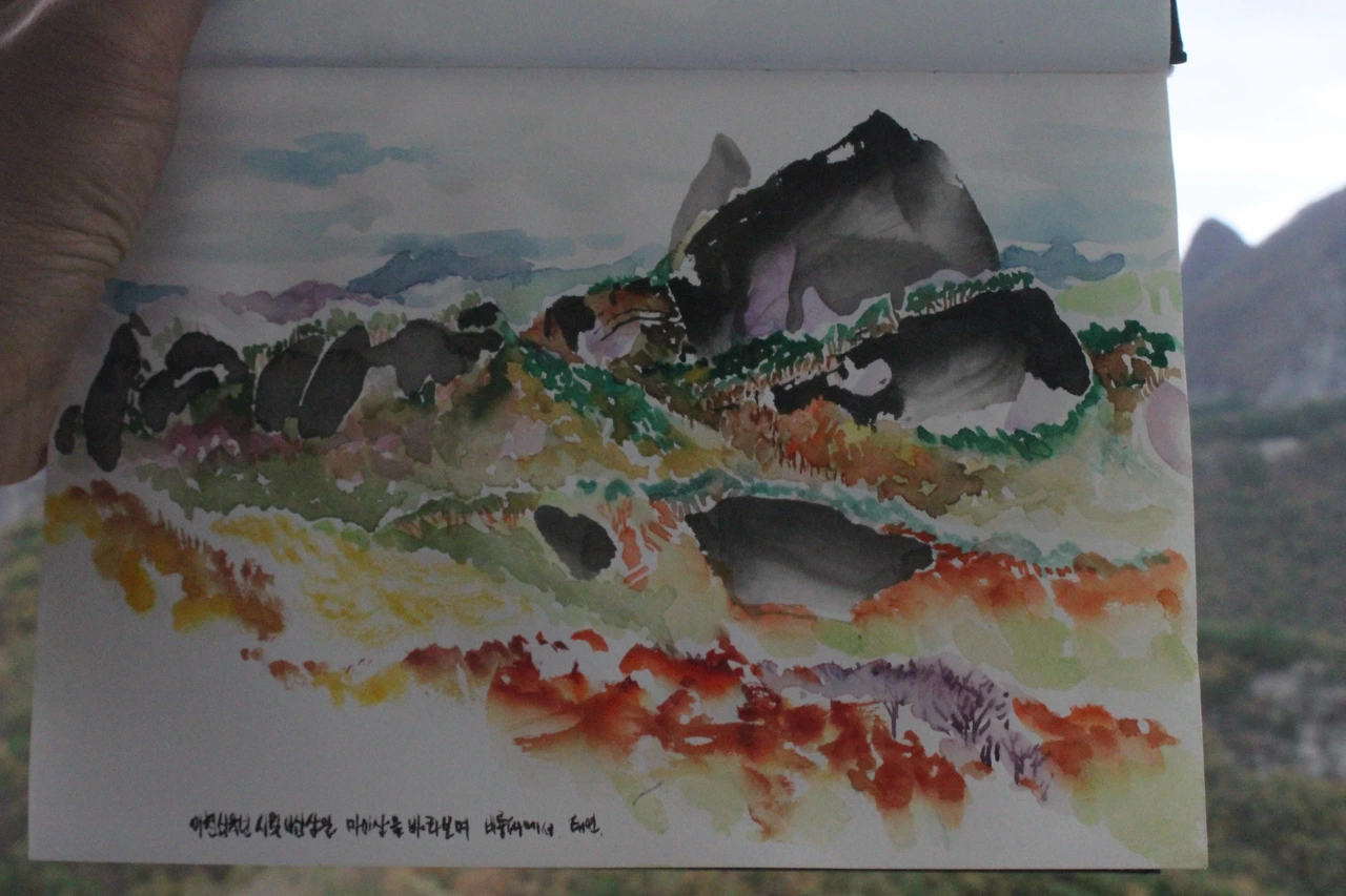 그곳에서 보는 아름다운 봉들의 모습을 놓치기 싫어 이내 자리 잡고 그려나가기 시작한다.