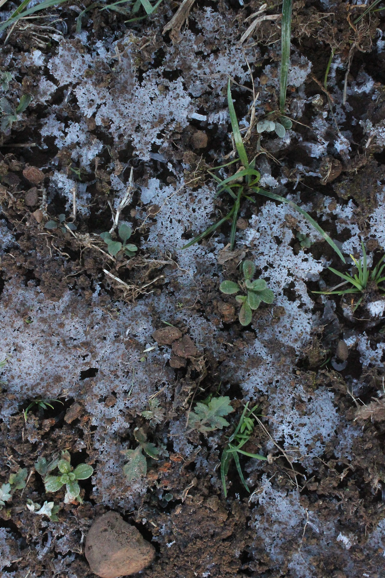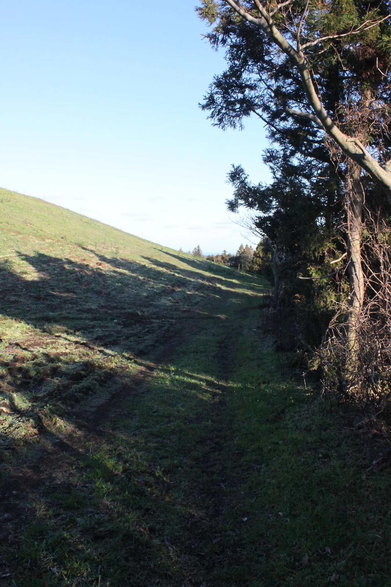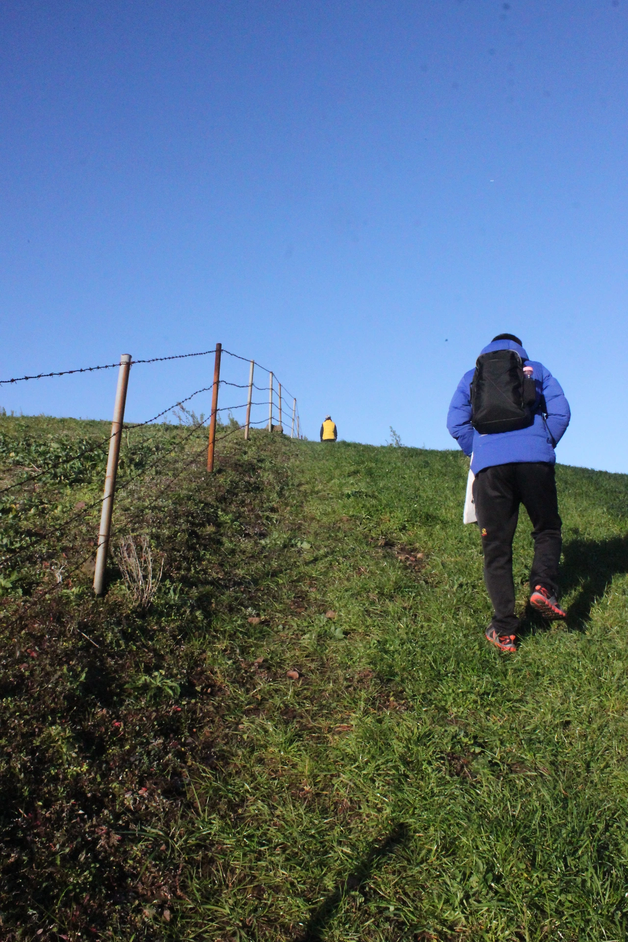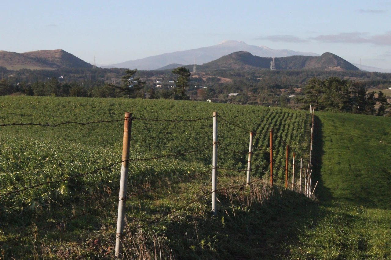 무밭을 지나 철조망을 따라 서리가 낀 언바닥을 밟고 3분 정도 올라서니 맑은 하늘에 '한라산'이 보인다.