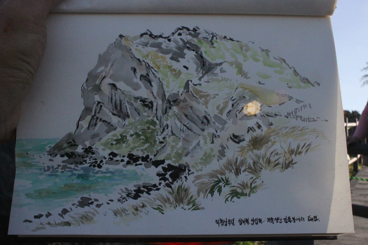 간신히 주차하고 나서 동생은 일출봉으로 올라가고, 나는 '해녀의 집'으로 꺾이는 삼거리쯤에서 일출봉의 서쪽 얼굴을 그린다. 동쪽 얼굴은 자주 그렸었으나 보기만 하고 지나치기만 했던 서쪽 방향은 바위가 드러난 민낯이다.