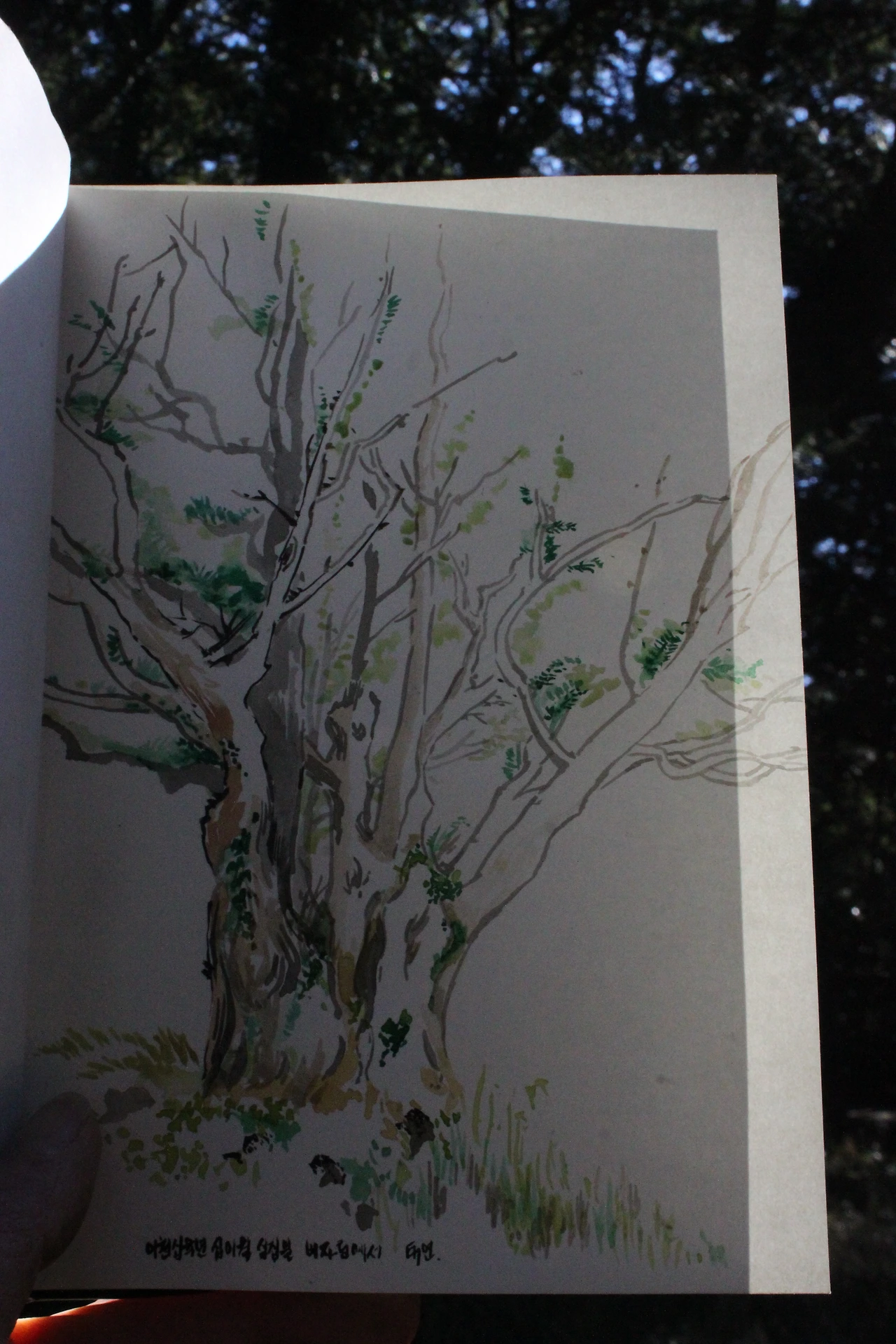 그 나무를 조금씩 종이에 박아내며 숲에서의 시간을 누려본다. 돌담 쪽으로 돌아 나오며 숲이 주는 생명수를 약수로 나눠먹으며 비자림의 아름다움에 시원함을 더한다.