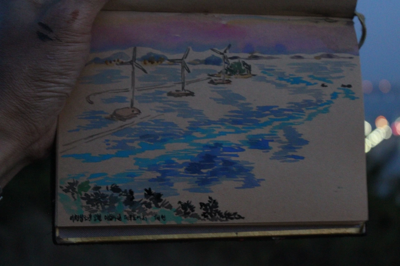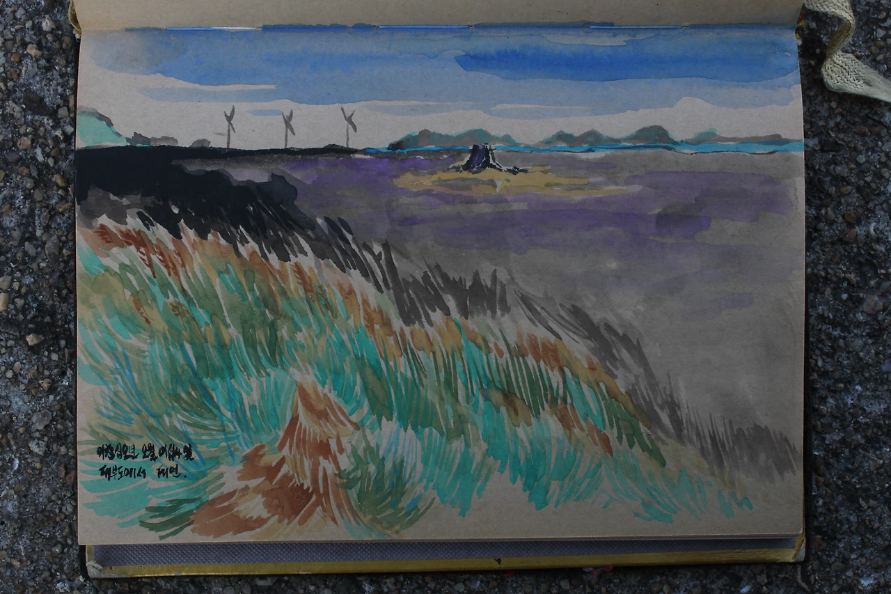 사진을 찍으며 나도 모르게 스케치북을 꺼내들었다. 해가 지려면 5 분여 남짓.. 해는 지고 그 색깔을 재현하려니 재현이 무색하게 아름다웠던 하늘,,, 하늘.