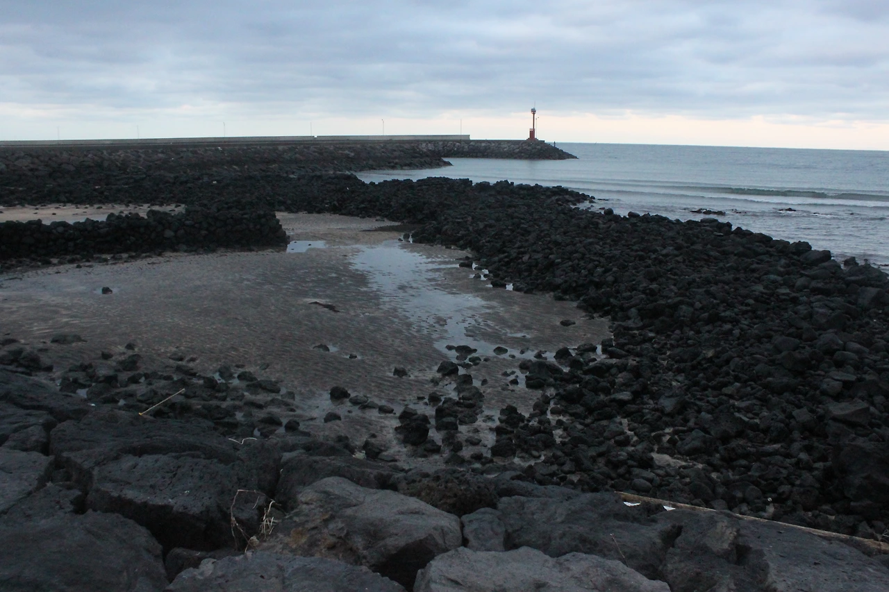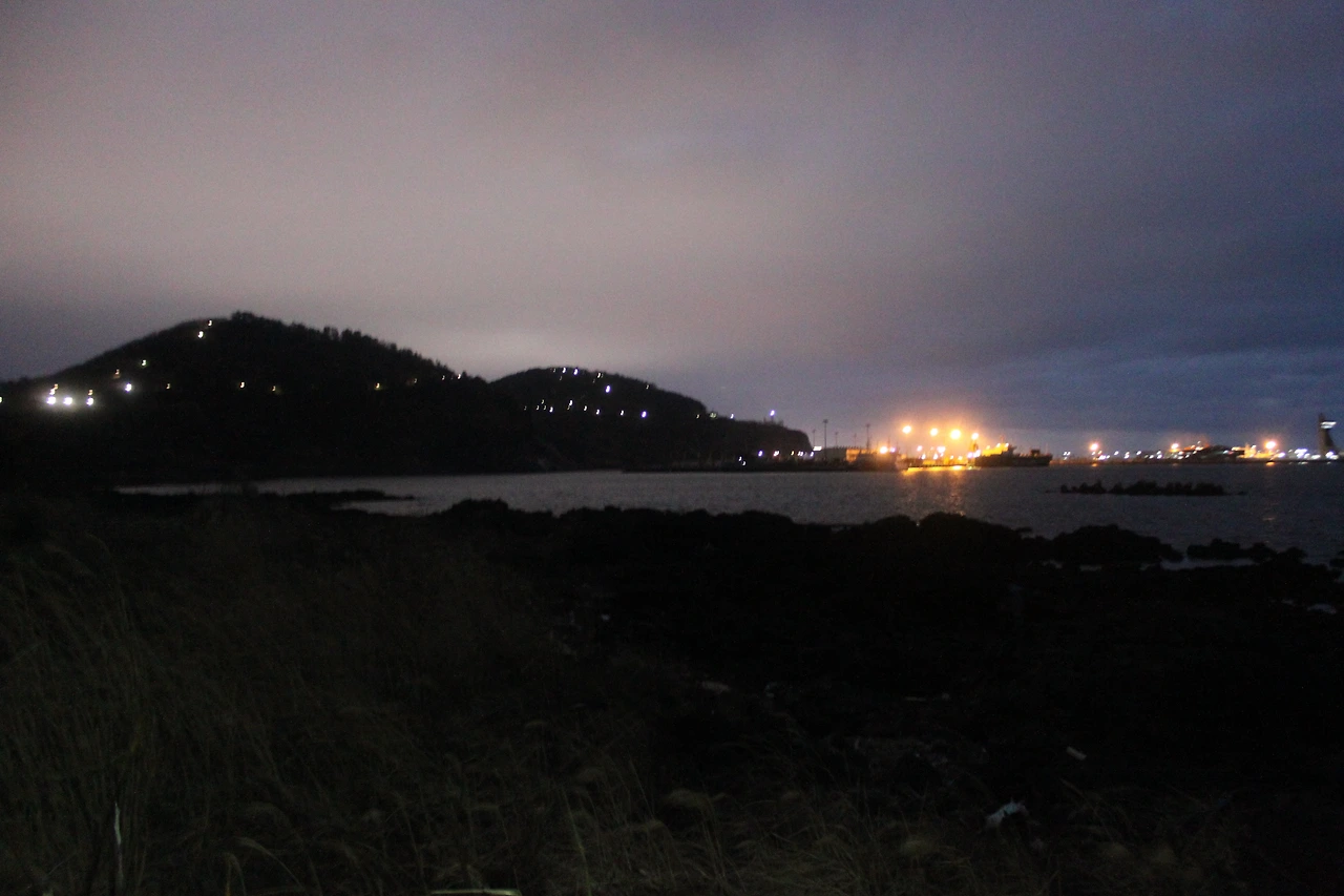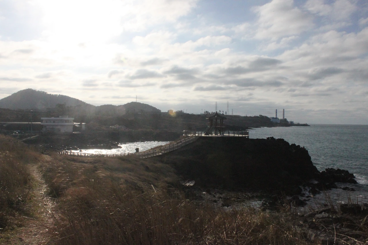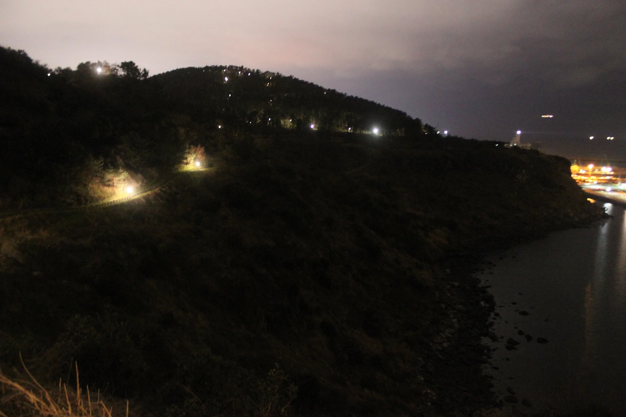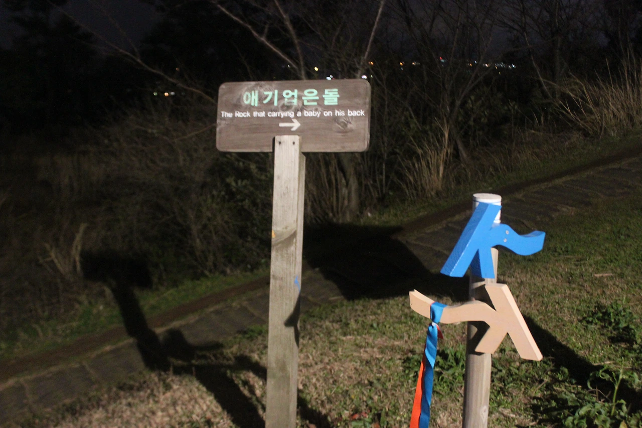 어두워지는 바닷길을 따라 '화북포구'에 도착한다. '곤을동 마을'을 지나 다리를 건너 어두워진 냇가를 건너다 미끄러질 뻔했다. 조명이 없어 조금 위험하다가 길을 따라가니 '별도봉체 갈림길'로 가는 길은 조명이 있어 상대적으로 편하게 간다. '애기업은 돌'을 지나는데 제주도분이 의미가 아기를 업은 게 아니라 떨어지지 않고 산에 잘 매달려 있다는 의미의 '애기업은 돌'이라고 한다.