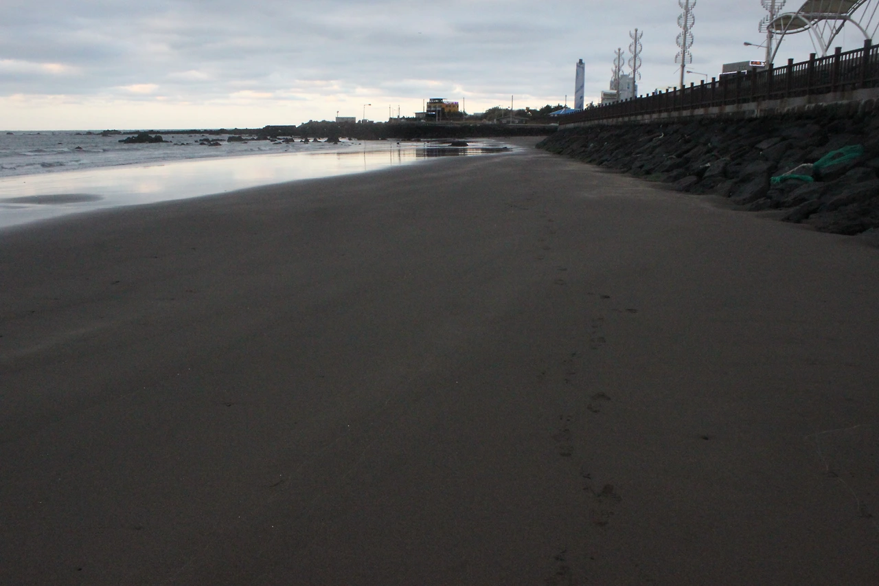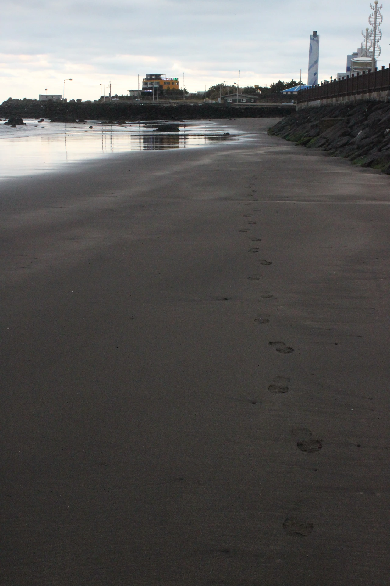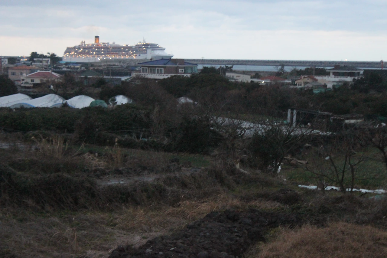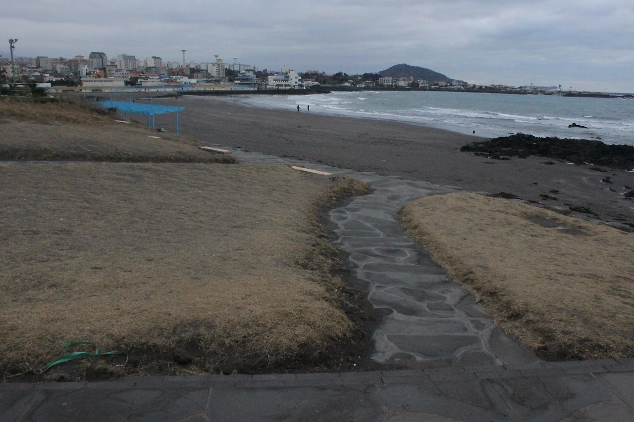 '삼양 검은 모래 해변'에 도착하니 이렇게 고운 검은 모래가 펼쳐진 해변이 우리나라에 있다니 너무 아름다워 입이 닫아지지 않는다. 아무도 걷지 않은 길을 걷다가 위에서 내려다보니 생각보다 길다. 아쉬운 게 있다면 유실되는 중인지 모래 밑에 다른 모래를 넣어 높이 올린듯한데 그 모래자루가 유실되어 보여서 시술한 수술 자국들처럼 보여 아쉽다. 해변을 걸어 '별도연대'로 가다 마을 어귀에서 '유람선'을 본다.