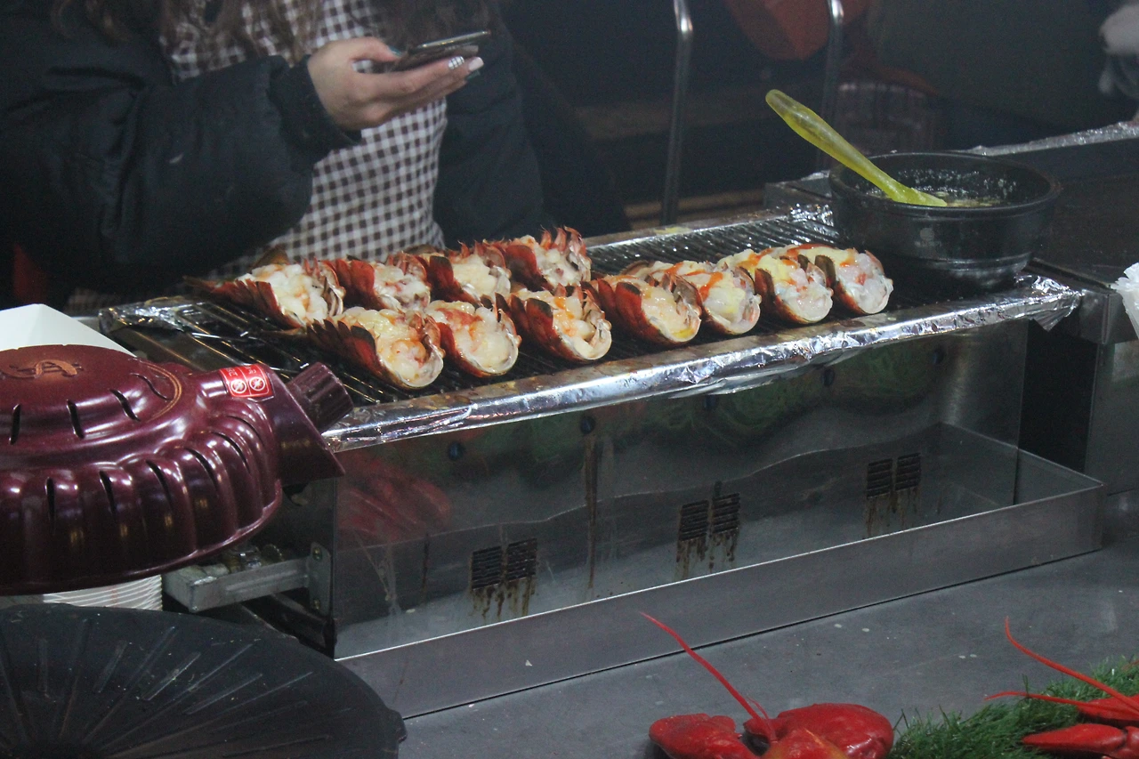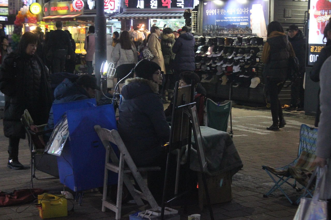 길거리 음식 중에 눈에 띄는 건 단연 '랍스터 치즈 구이' '게 튀김'도 식감을 자극했고 '딸기 찹쌀떡'과 '떡갈비 꼬치'도 눈과 침샘을 자극했다. 한쪽에서 거리의 화가들이 외국인을 그려주는 모습도 여전했고, 명동은 더욱 진화해 가는 것 같았다. 생각보다 관광객이 많지 않았지만 명동은 명동이었다.
