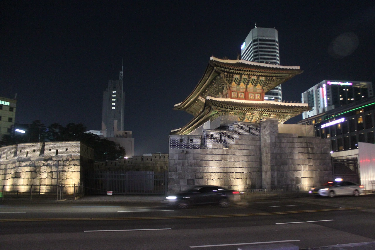동대문을 연결하는 성벽들이 노란 암바 조명을 받으며 길게 늘어져 있고, 까만 천 위에 노란 귤껍질을 말리는 듯