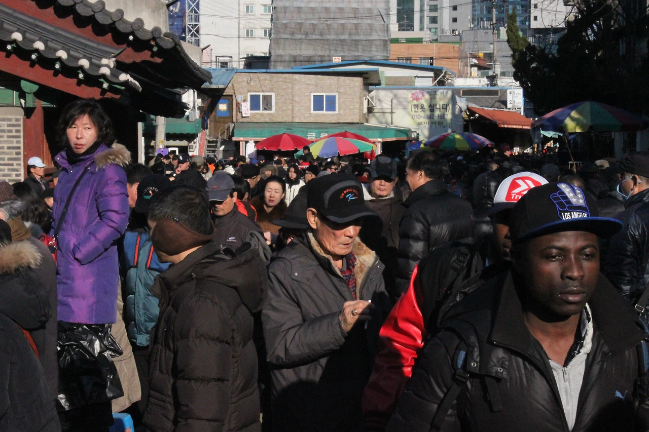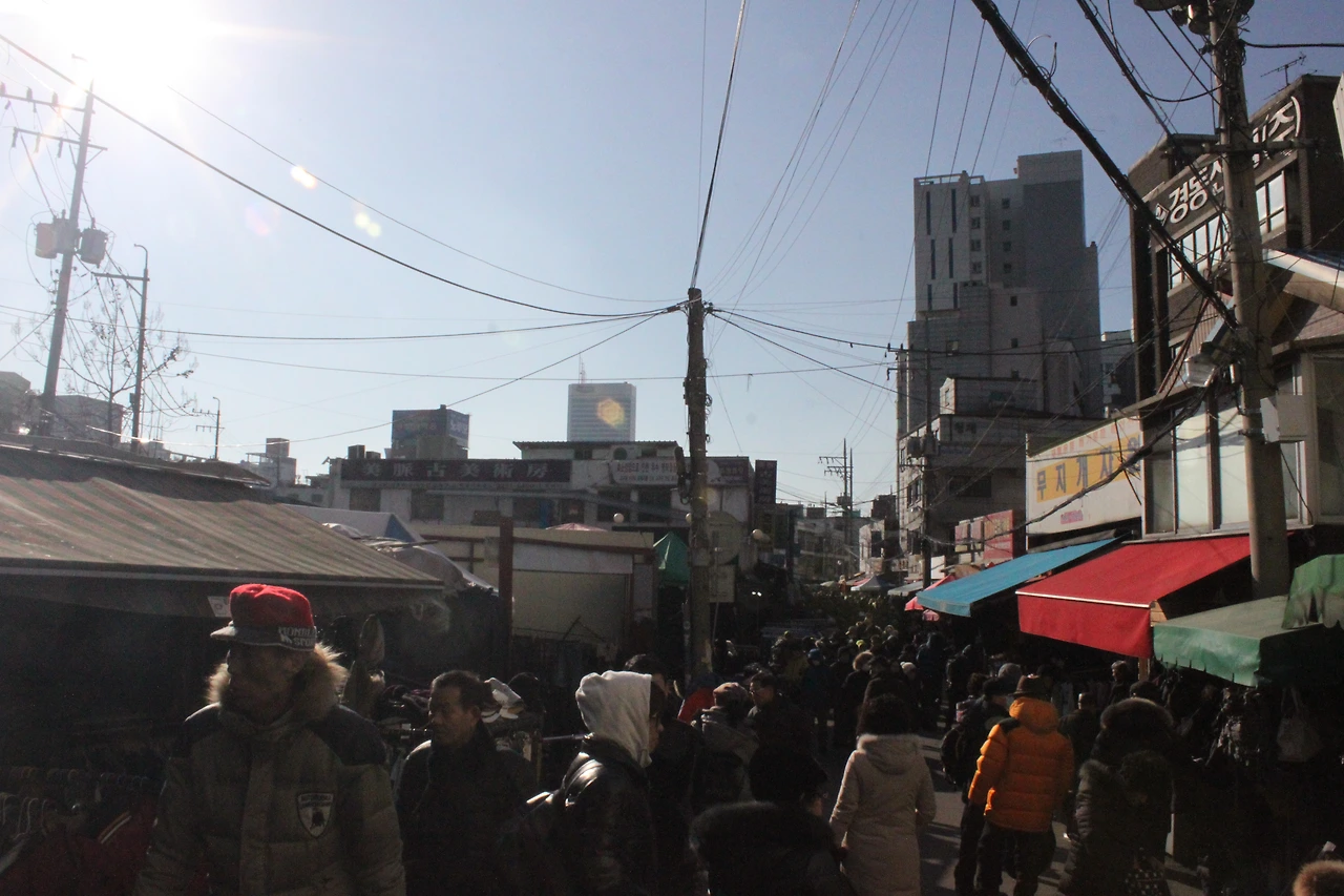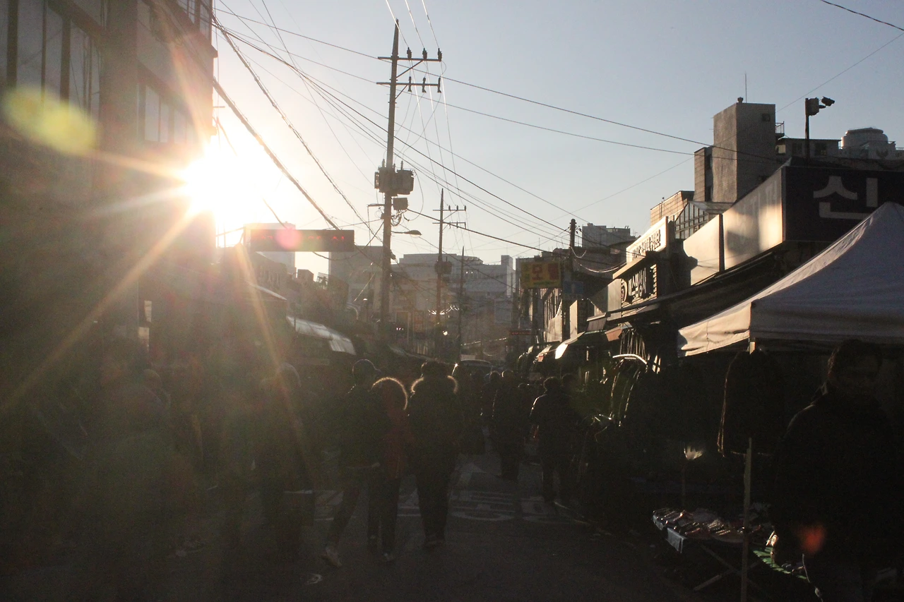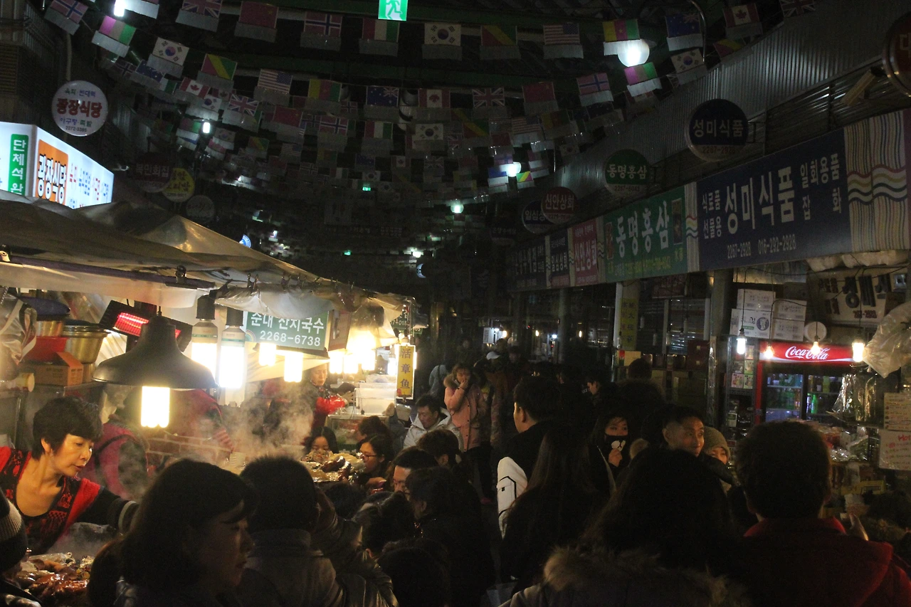 그 게스트 하우스 몇 개를 지나쳐 시내로 올라가니 자정이 넘어도 사람들이 몰아친다는 '광장시장'에 도달한다.
