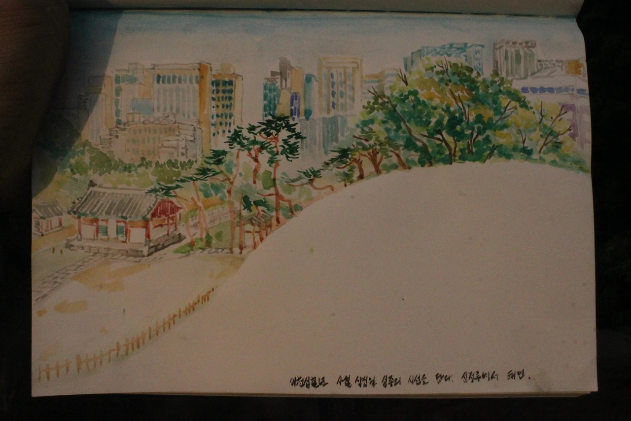 그림을 그리는 동안 많은 사람들이 지나친다.