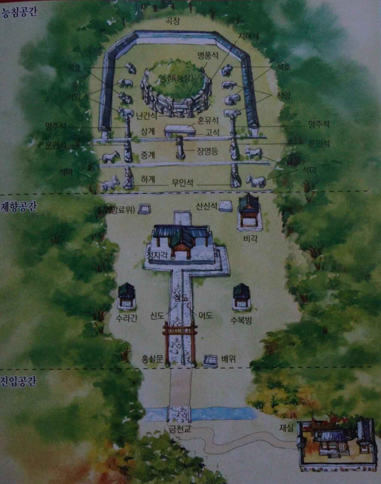능 앞쪽으론 제사를 지낼 수 있게 '정자각'이 있고, 오른쪽으로 왕의 '비각'이 모셔져 있다.