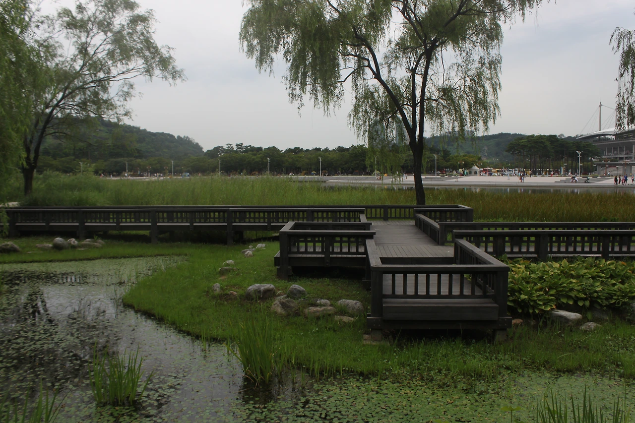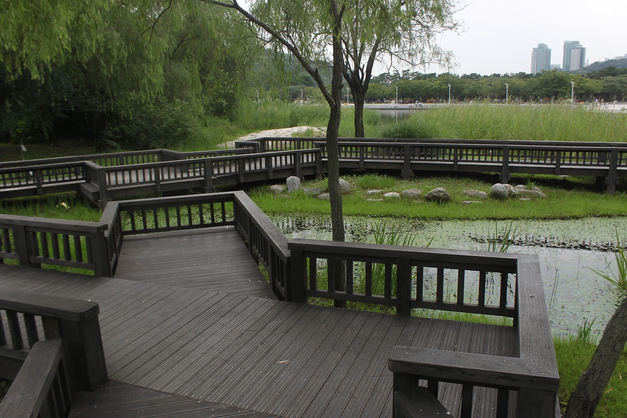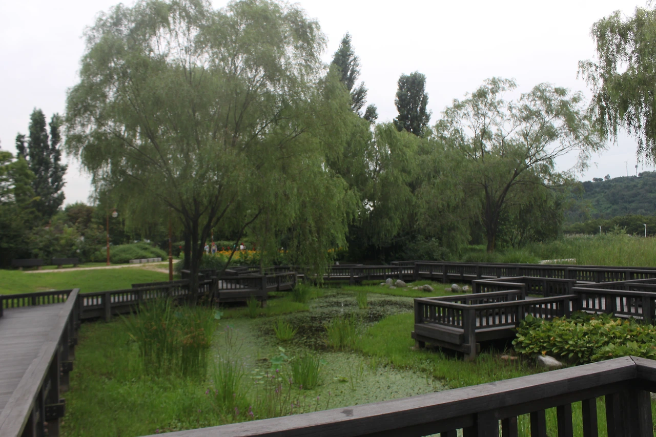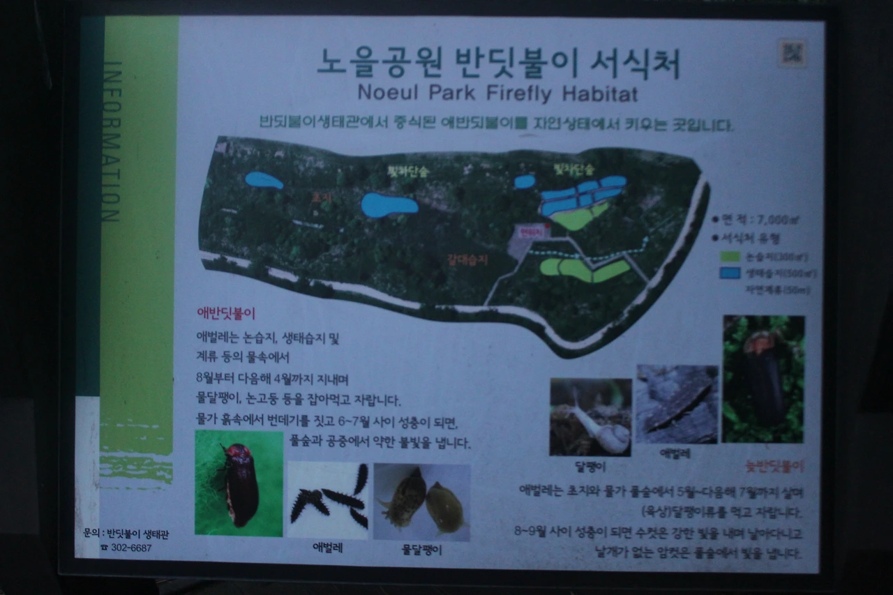 그 공간을 지나쳐 '노을 공원'으로 올라가는 입구를 찾는다. 올라가는 길에 맹꽁이 전기차가 올라가는데 나는 길을 조금 더 알아볼 요량으로 걸어가 본다. 걸어서 가는 길에는 나무가 울창히 사열해 있고 10여분 올라가니 노을공원으로 들어가는 입구에 도달한다. 조형물이 반기는 그곳에서 숲으로 들어가니 '반딧불이 서식지'가 습지로 조성되어 있다. 아직 날이 밝은 데다 계절이 늦어 반딧불이를 보기 힘들 것 같아 사진만 찍고 지나친다.