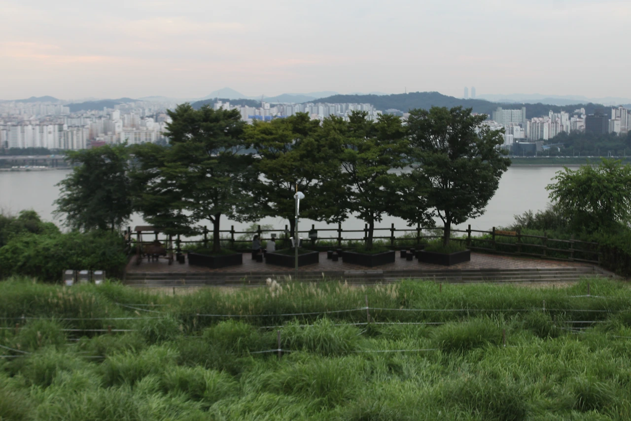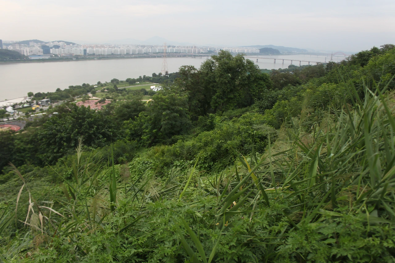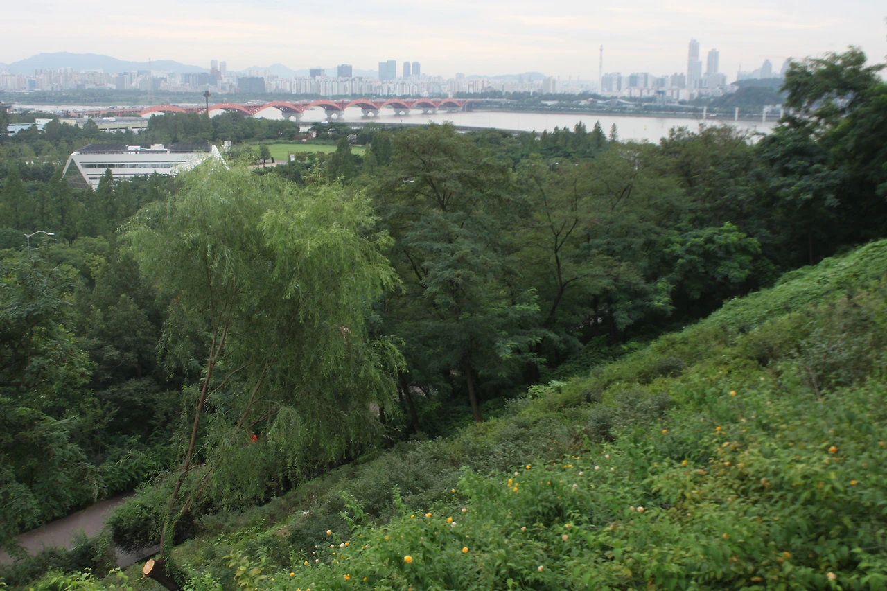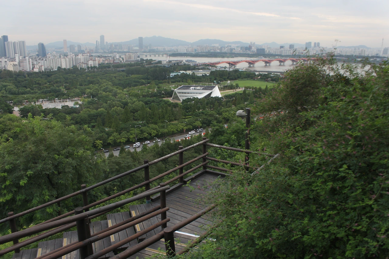 한강변 풍경을 내려다보기 위해서 너머에 있는 데크가 있는 길로 가로질러간다. 데크에서 바라보는 한강에선 '양화대교'와 '선유도' 그리고, 이제 튼튼한 다리를 만들기 시작한 '월드컵대교'도 '한강'은 항상 아름답다.