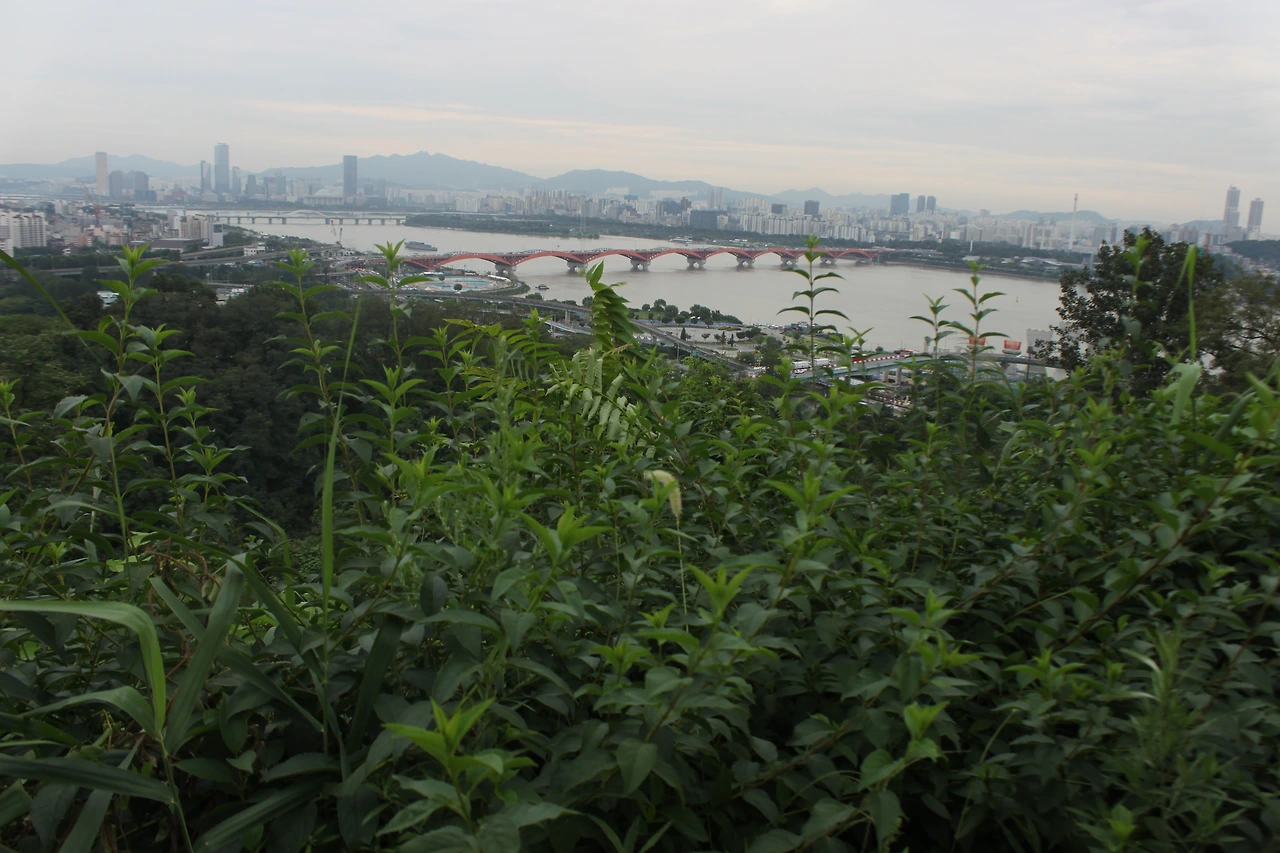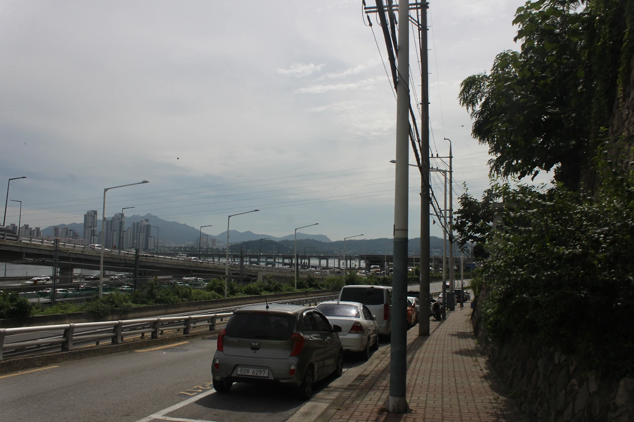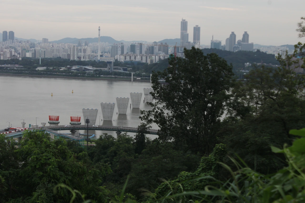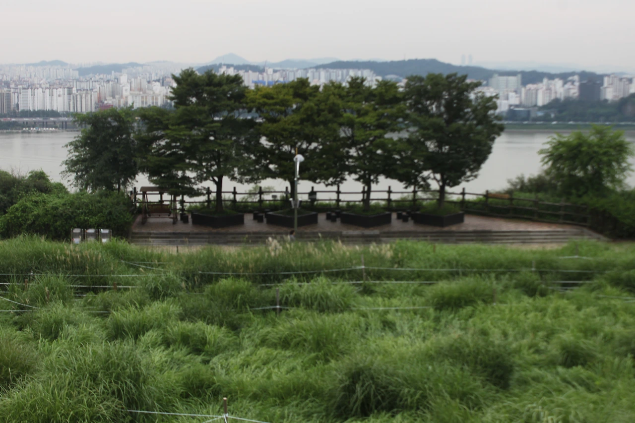 한강변 풍경을 내려다보기 위해서 너머에 있는 데크가 있는 길로 가로질러간다. 데크에서 바라보는 한강에선 '양화대교'와 '선유도' 그리고, 이제 튼튼한 다리를 만들기 시작한 '월드컵대교'도 '한강'은 항상 아름답다.