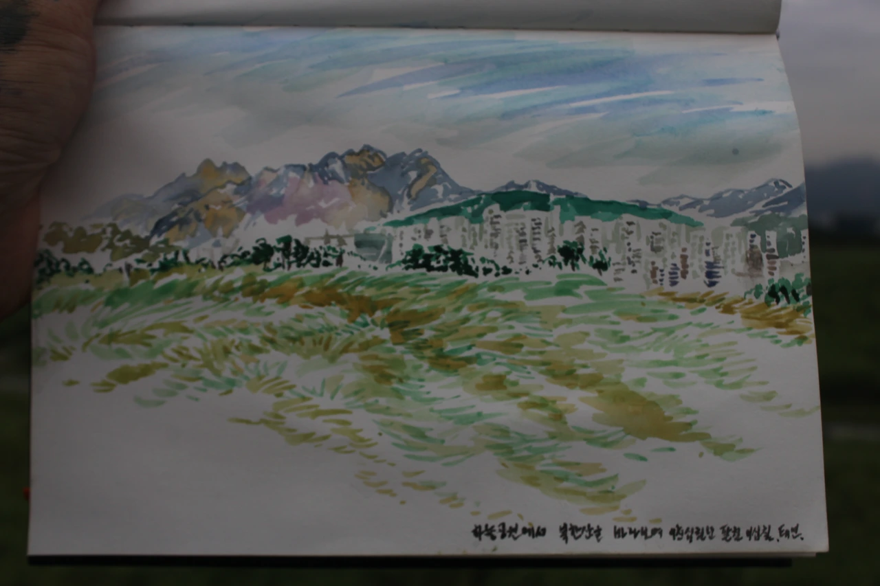 사람이 많았는데 잠깐 사람이 없어 즐겁게 둘러보다가 역시나 억새들 위로 '북한산'이 아름다운 조각처럼 멀찌감치 새워져 있어 물감을 꺼내 아름다운 그 모습을 가볍게 담는다.