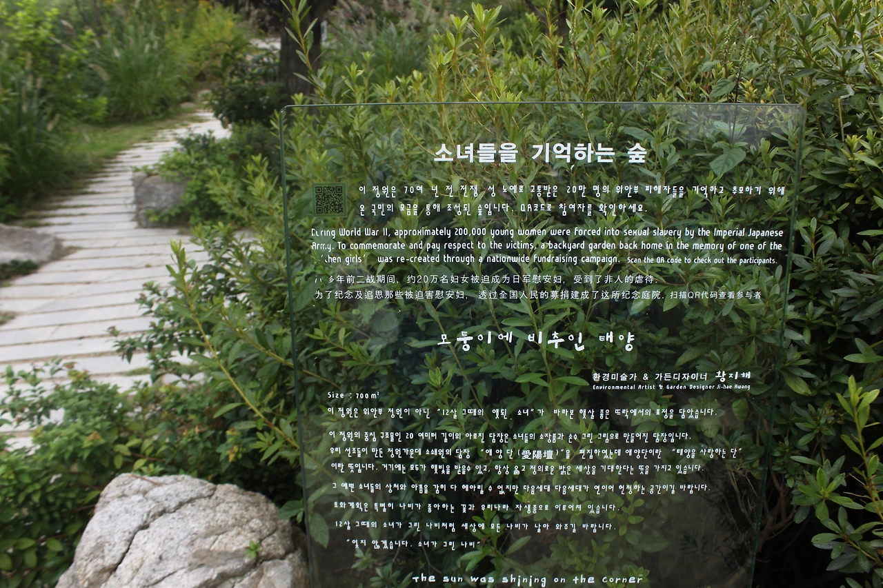 1번으로 제일 먼저 보이는 정원은 위안부 할머니들을 주제로 '소녀들을 기억하는 숲' 이란 정원이었고, 그 뒤로 2번은 아이가 되었을 때 갖고 싶은 정원으로 만들어 졌다. 라운드형 의자가 아이들만 들어가서 편히 바라볼 수 있는 아늑한 공간이었다.