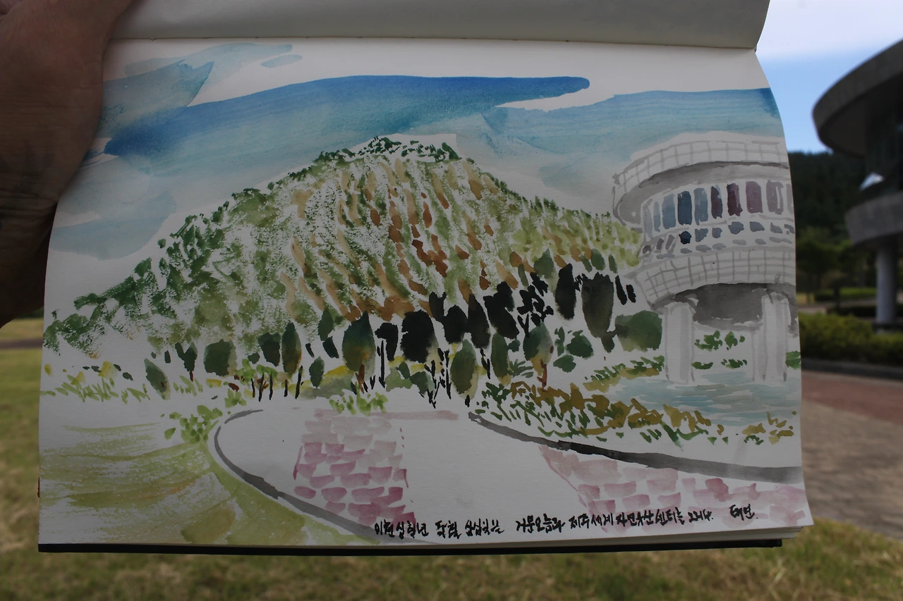 검은색, 주황색, 빨간색 순으로 완전 타버린 것인데 검정 돌은 철분이 함유되어 있어 자석으로도 붙을 수 있단다. '산수국' 헛꽃에 야광 성분이 있어 밤에 곤충을 유혹하는 역할을 해서 '도깨비 꽃'이라고 한다고 하며, 집 주변에 심지는 않는다고 한다. '세계 자연 유산센터'에 내려와 스케치를 한다.