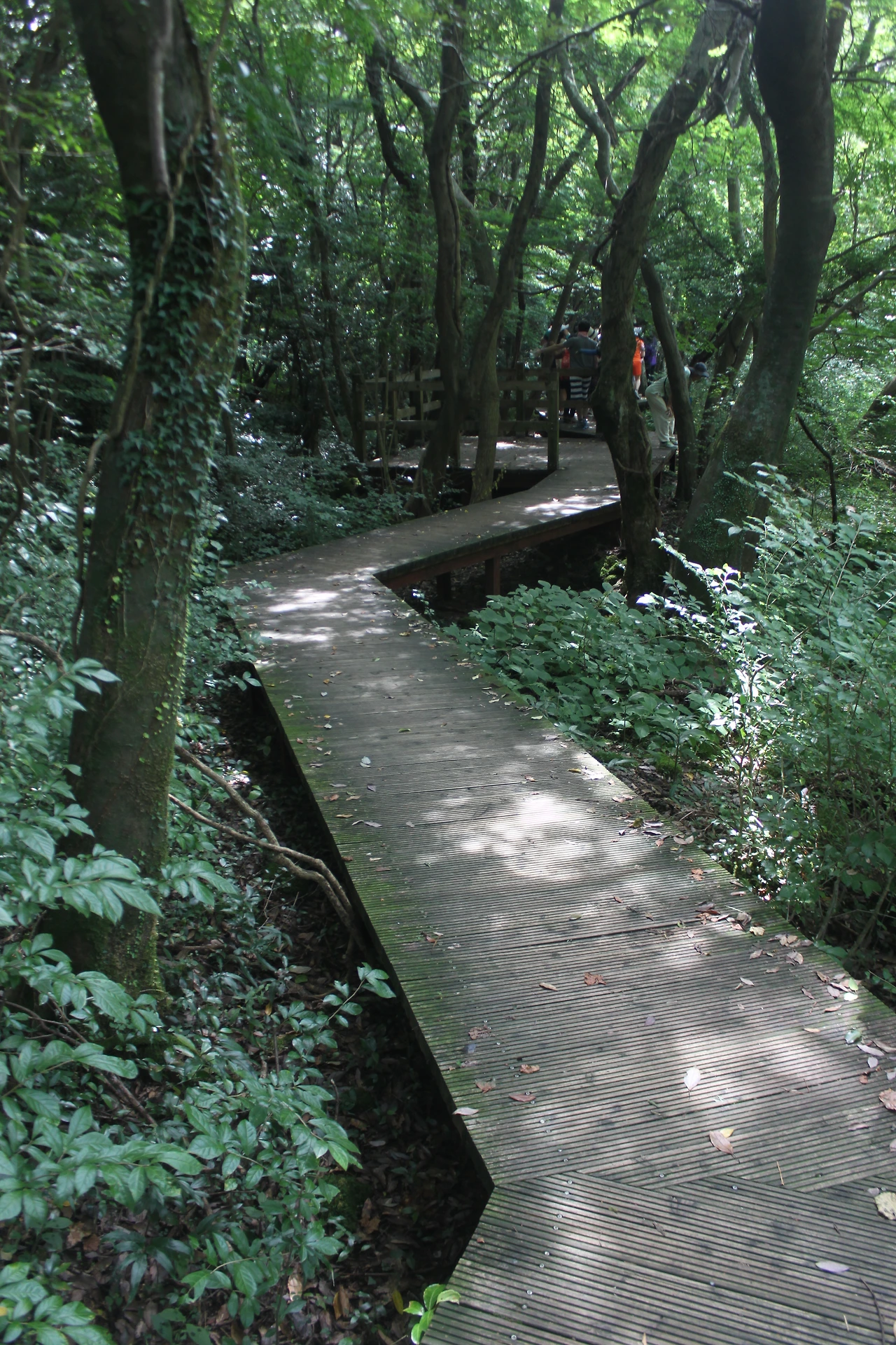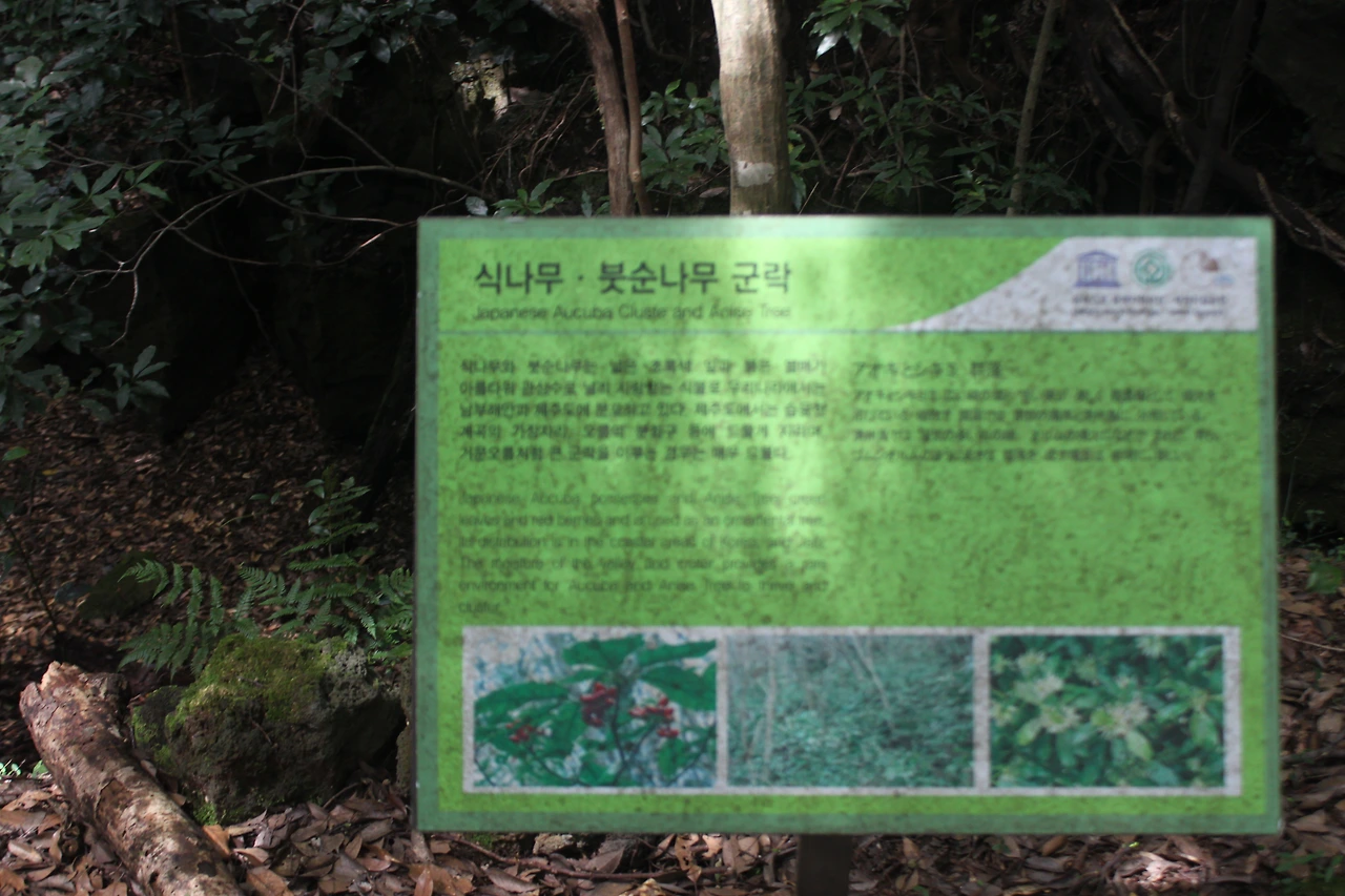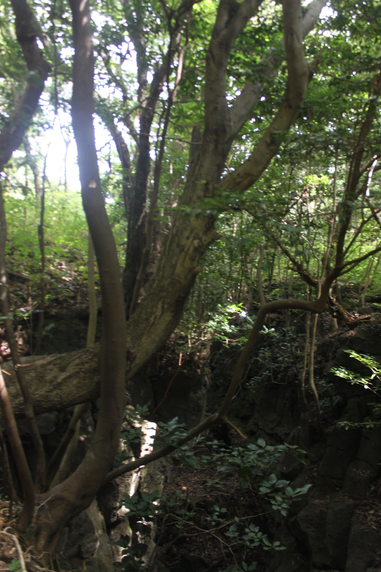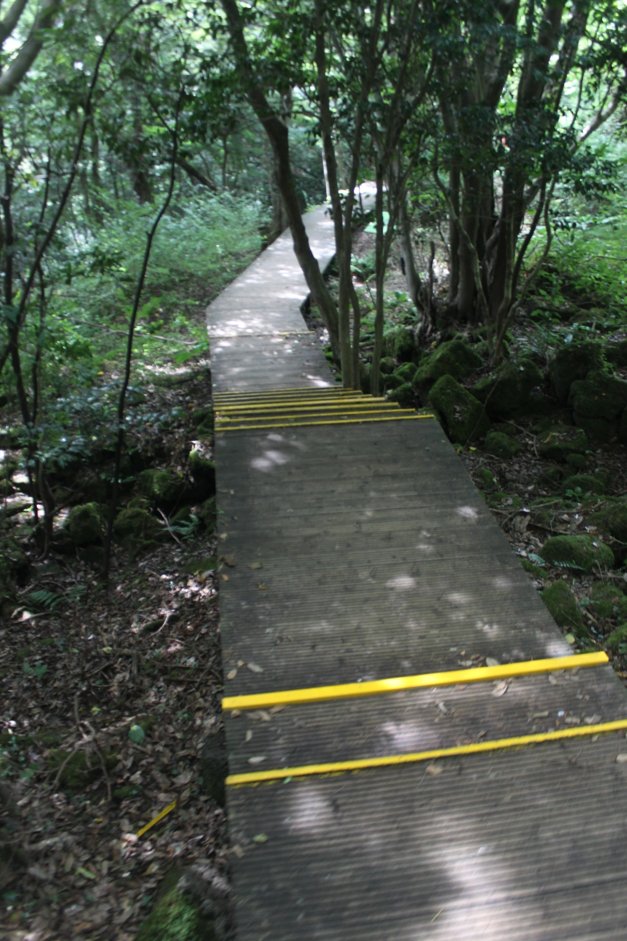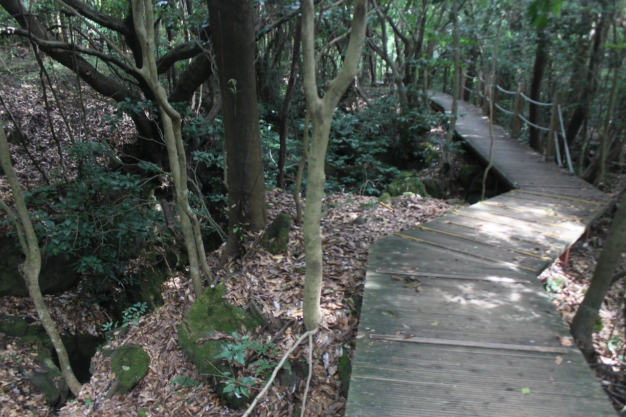 시원한 바람을 타고 정상에 오르자 오름의 봉우리 봉우리들이 한눈에 보이고, '삼나무 숲'이 눈과 호흡이 편안하게 해준다. a코스는 여기까지이고 b코스는 분화구의 안쪽 깊숙이 식물들의 자생지들을 찾아간다. '용암협곡'을 지나 '식나무 붓순나무 군락지'를 지나 '곶자왈'을 지난다. '곶'은 숲, '자왈'은 바위나 자갈을 의미한다고 한다.