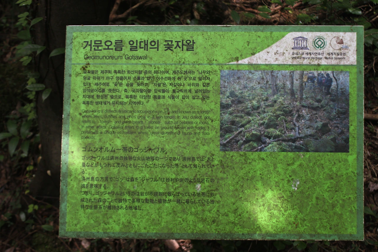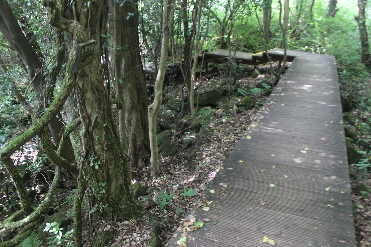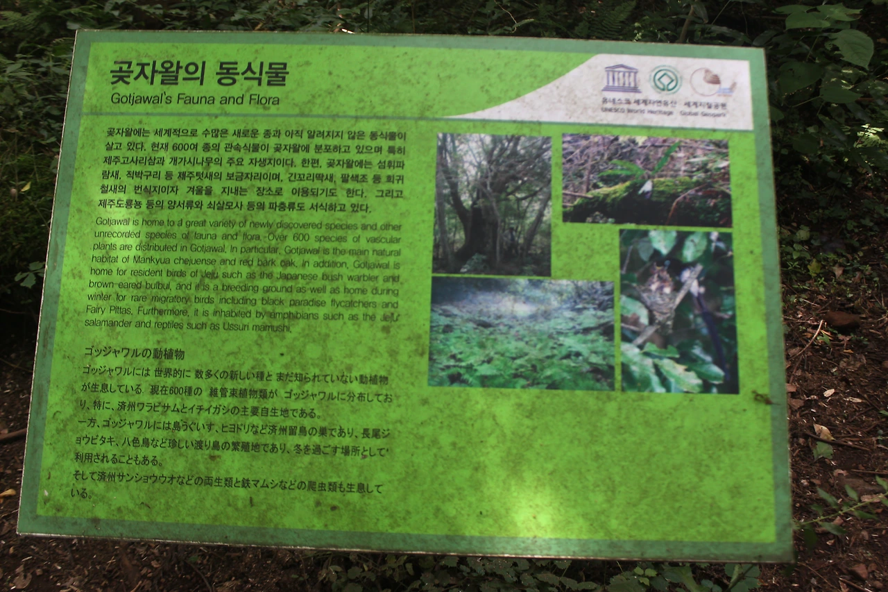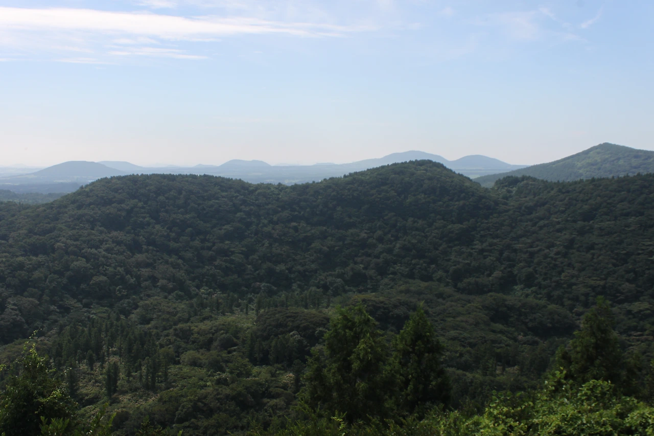 시원한 바람을 타고 정상에 오르자 오름의 봉우리 봉우리들이 한눈에 보이고, '삼나무 숲'이 눈과 호흡이 편안하게 해준다. a코스는 여기까지이고 b코스는 분화구의 안쪽 깊숙이 식물들의 자생지들을 찾아간다. '용암협곡'을 지나 '식나무 붓순나무 군락지'를 지나 '곶자왈'을 지난다. '곶'은 숲, '자왈'은 바위나 자갈을 의미한다고 한다.