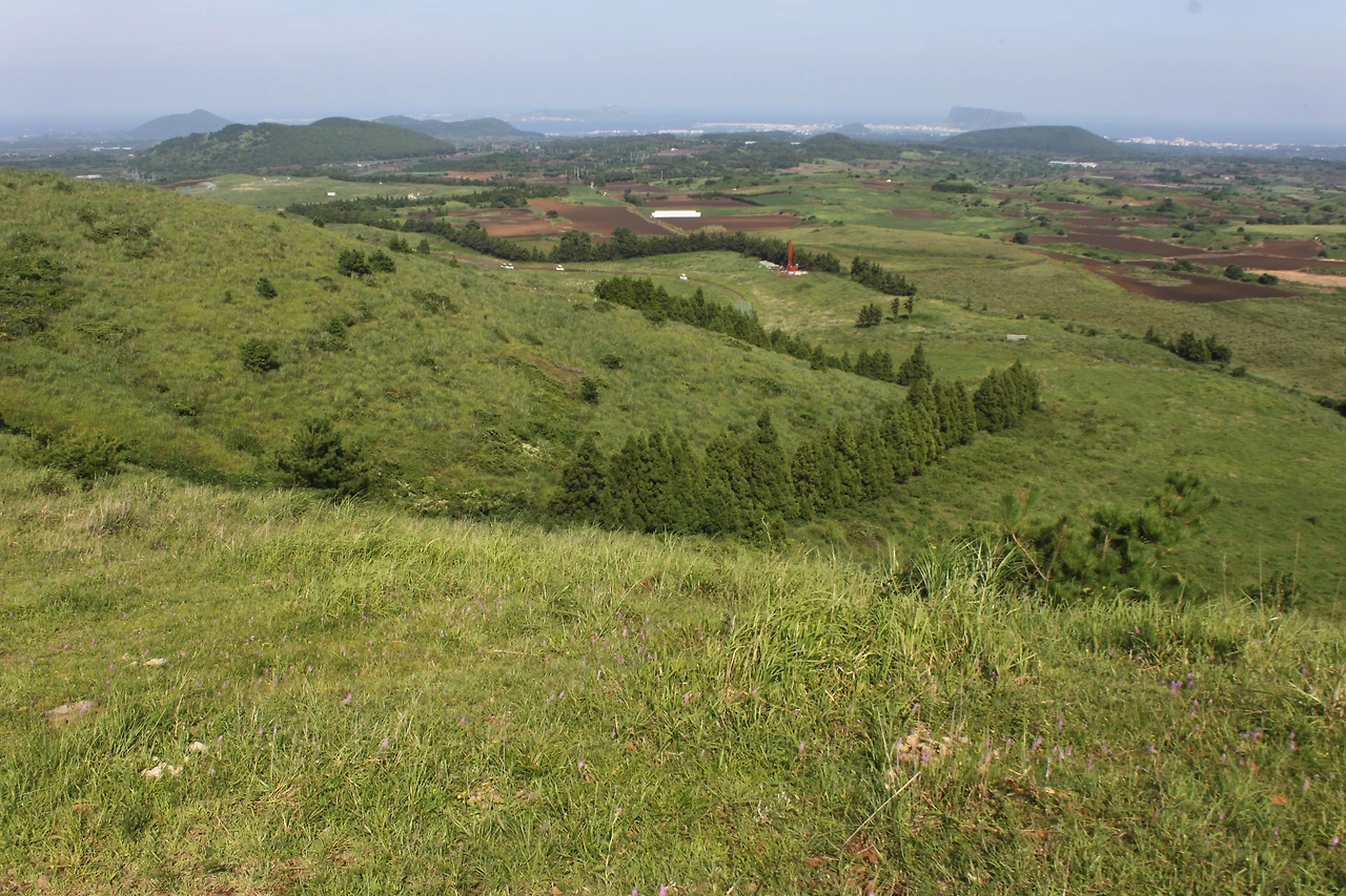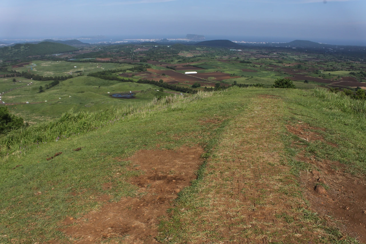 정상에 가까워질수록 '성산일출봉'과 '우도'가 멀찍이 보인다. 드디어 정상에 올라 내려다보는 풍광이 아름답고 시원하다. 커다랗게 뚫린 두 개의 구멍이 부감으로 보면 용의 눈 같기도 하다. 그 두 개의 눈에 바람이 머물러 오름들을 순회하는 것 같다. 바람에 오름의 대화를 실어 다른 오름에 전달하는 것 같다. 그 속삭임을 들으며 나도 대답하기 위해 붓을 들어 본다.