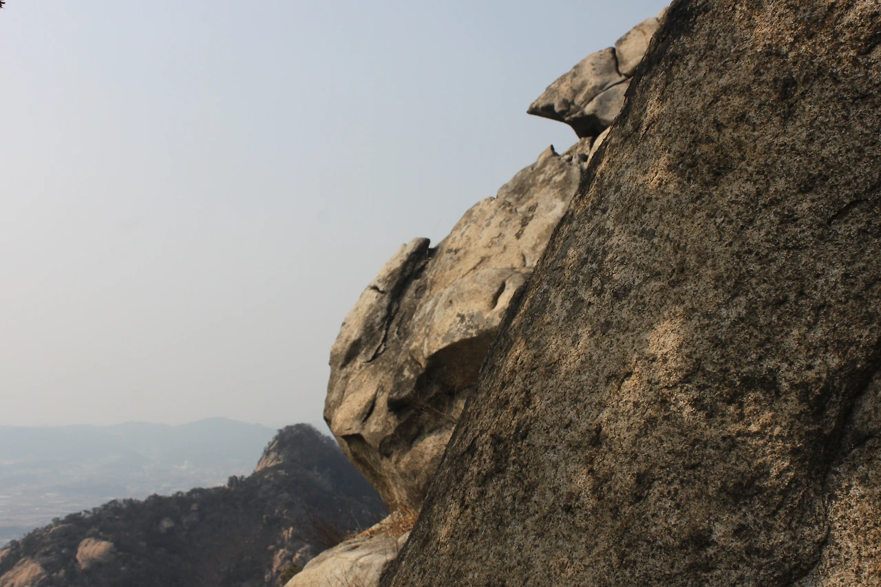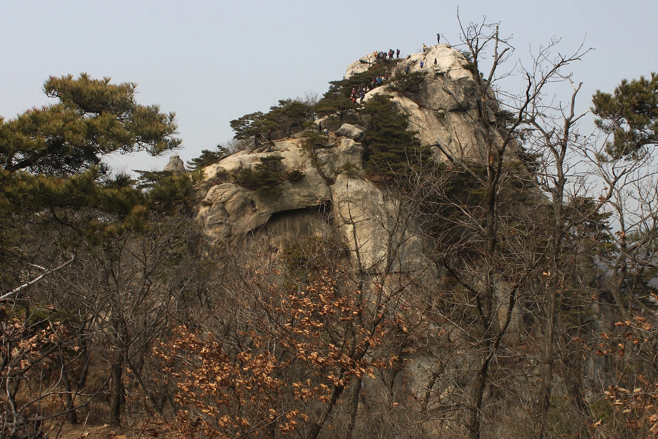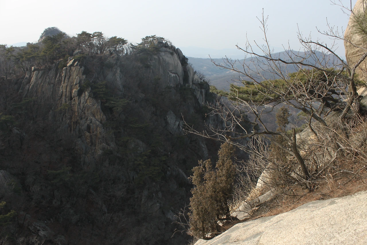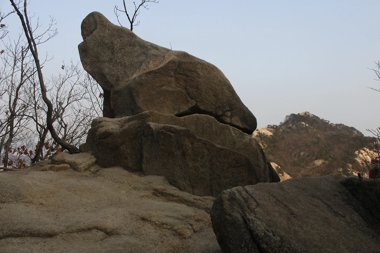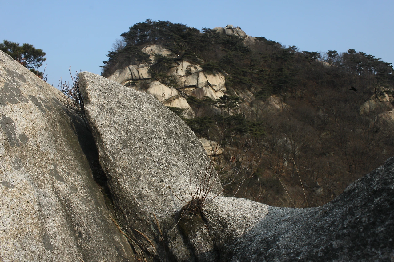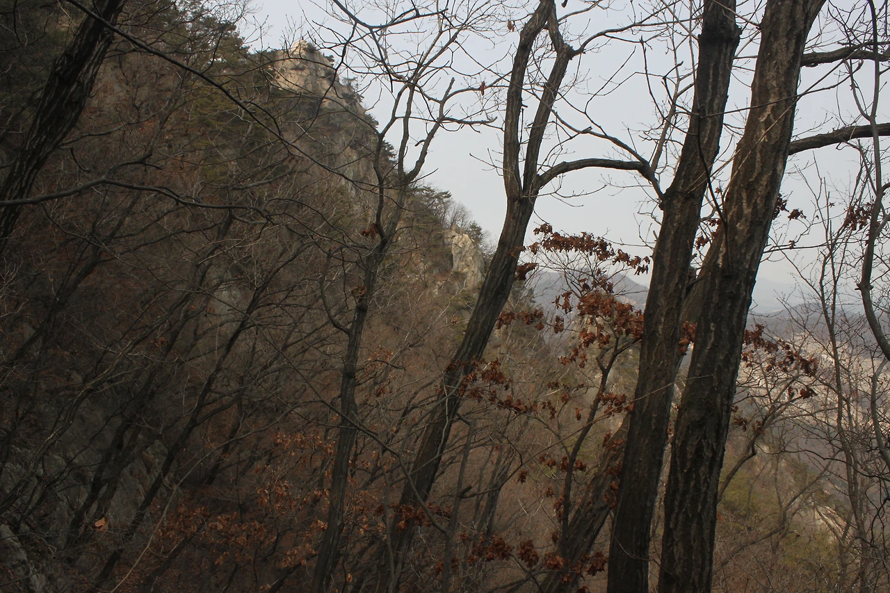 불곡산을 오르는데 포항에서 원정 산행 온 분들이 사투리를 시원하게 구사하신다. 포항에서 올 정도면 무언가 대단한 경관들이 숨어 있나? 기대감을 증폭시켜주고... 오르고 오른 불곡산은 기다란 보루로 조금 지루할 수도 있는 길을 30분 정도 오르게 했다.. 그러다가 여름에는 안보였을 아직 나무들만 있기에 보이는 아름다운 기암 괴석의 모습을 보고 길 아닌 가파른 산 벼랑 길을 따라 풍경을 살펴보았다.