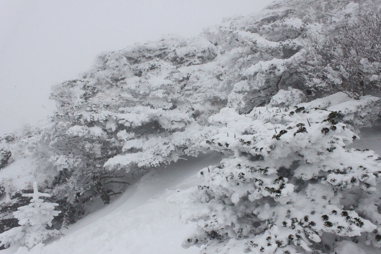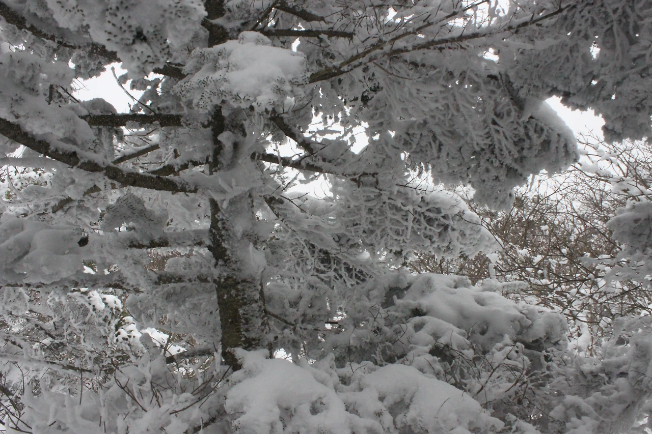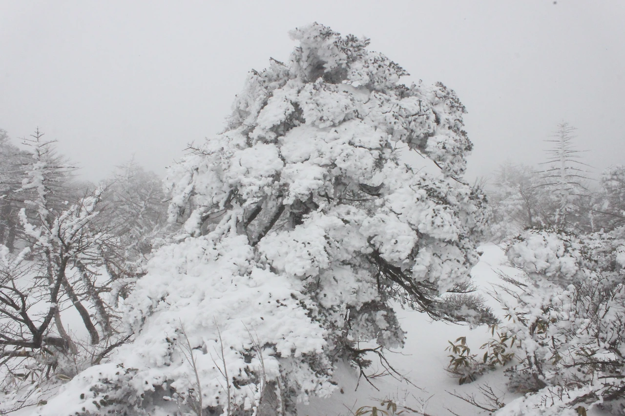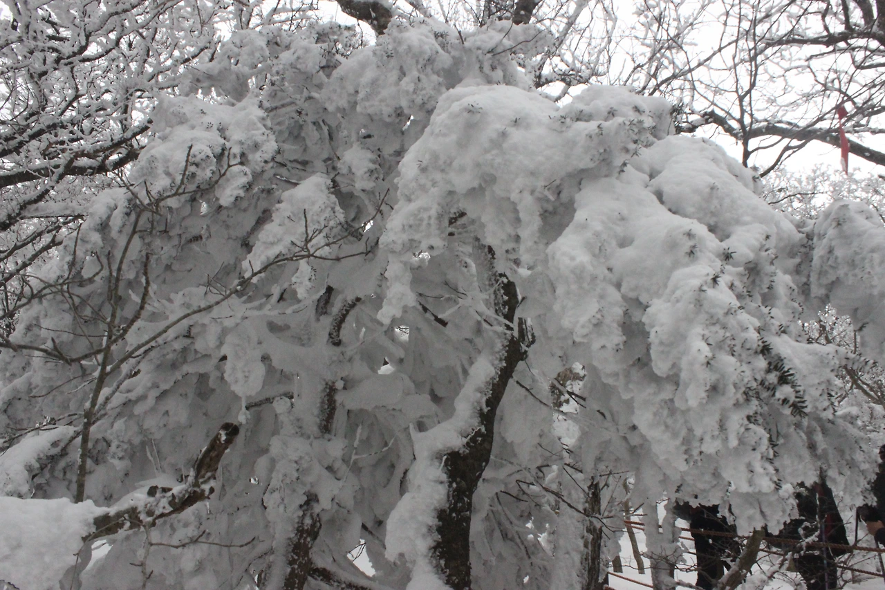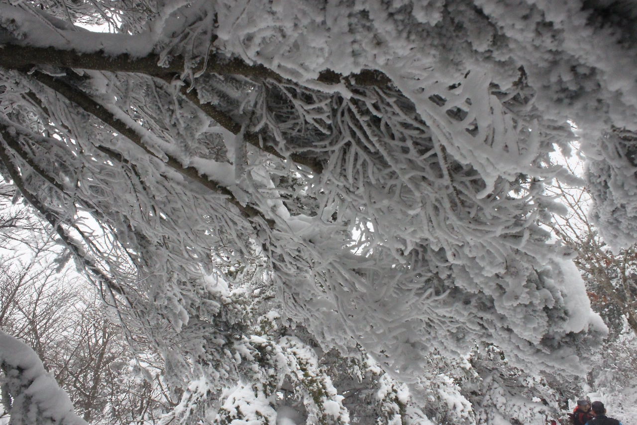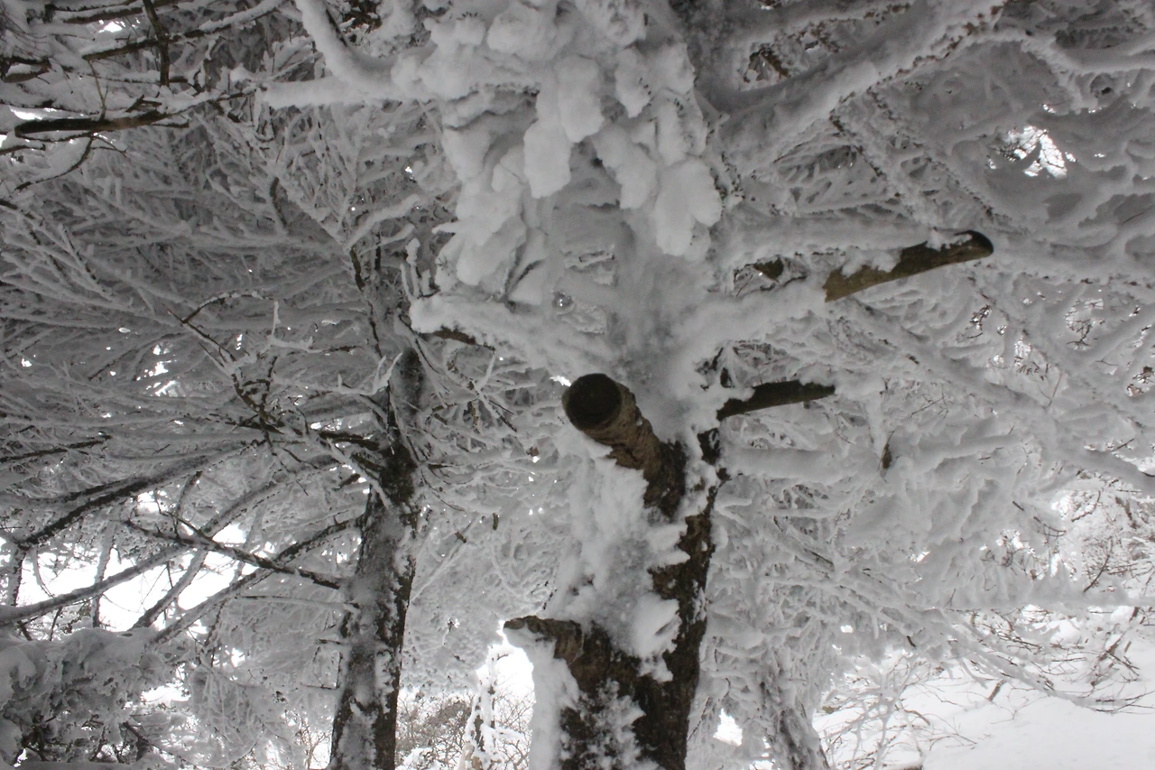 대피소를 통과해 경사가 점점 심해지는 길을 올라가다 보니 나무에 눈꽃이 마치 뼈대를 이룬 집처럼 그 하얀 속 뼈대들은 보여주어 마치 은은하고 찬란한 후광처럼 빛을 발한다.
