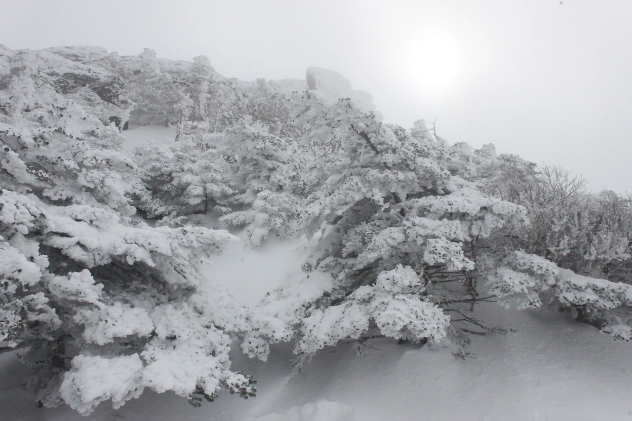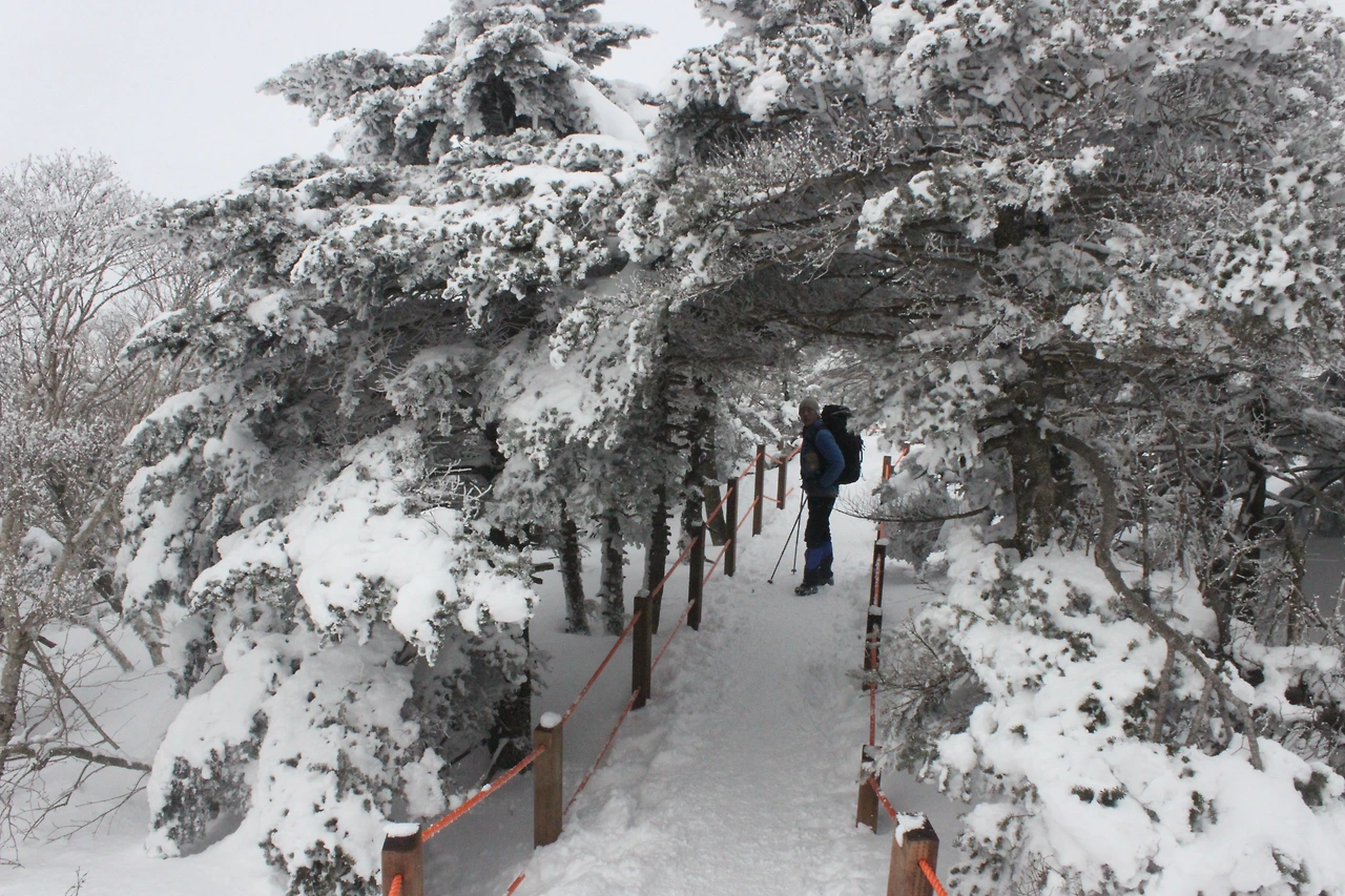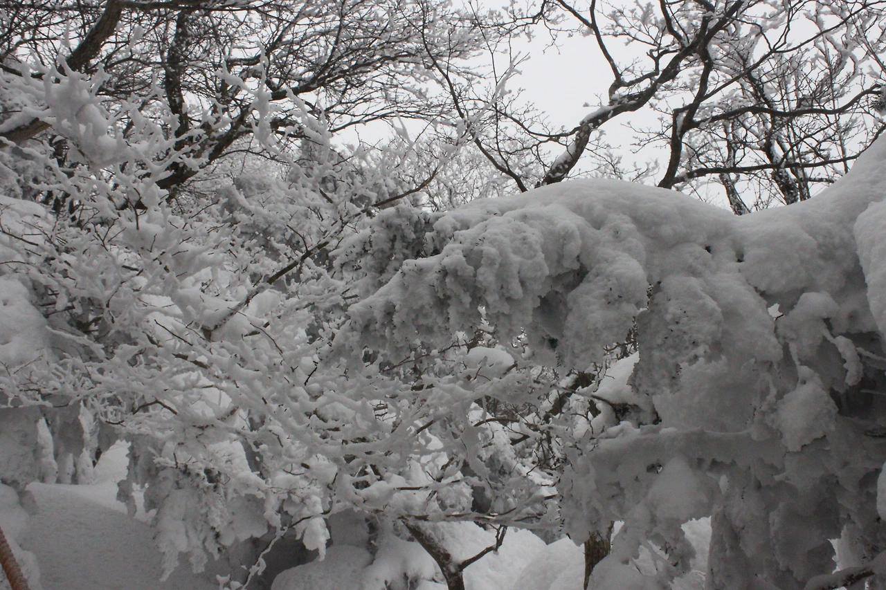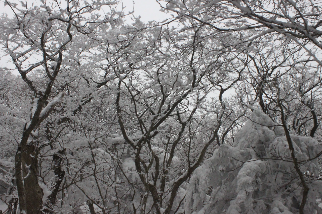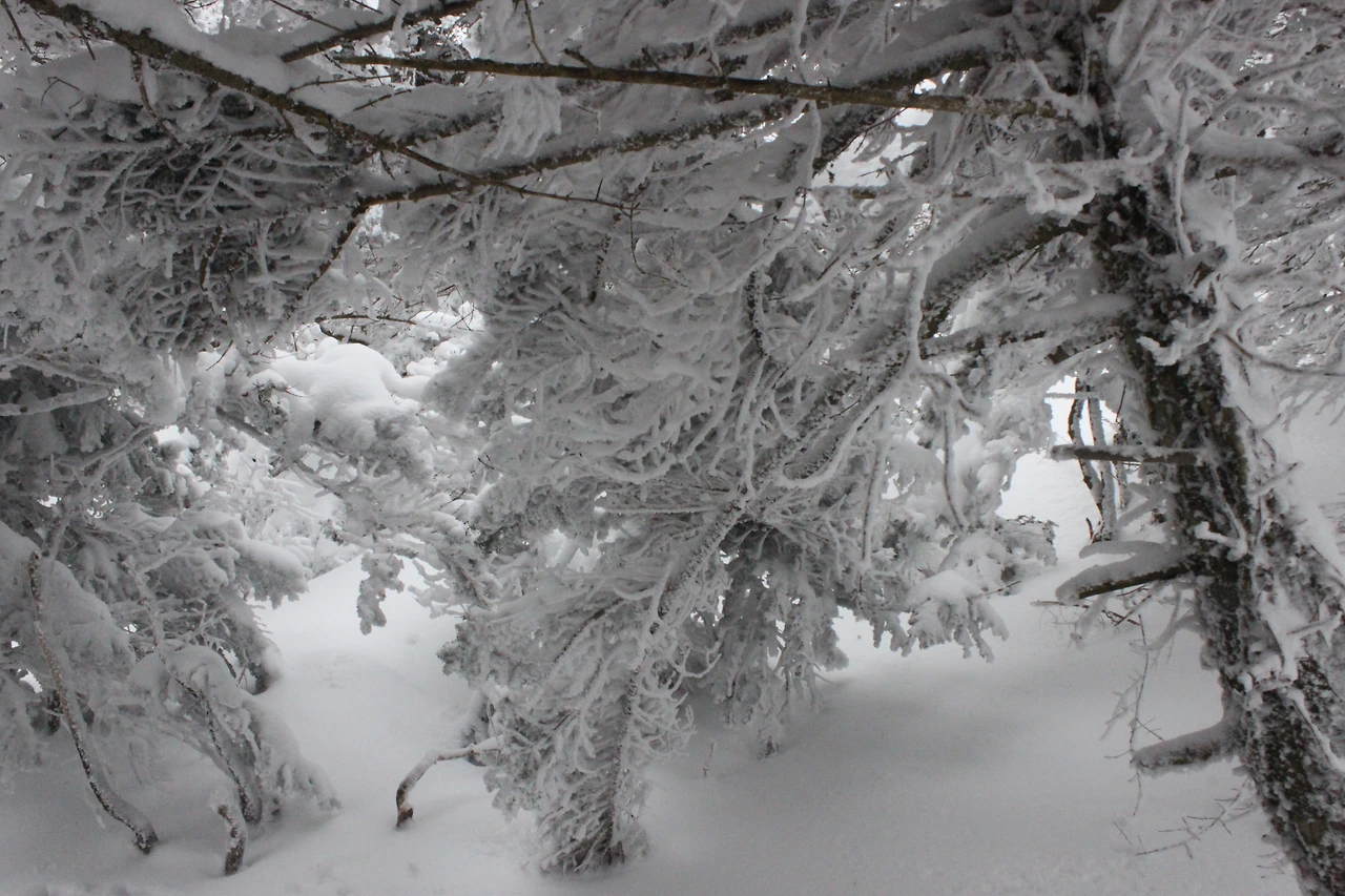 대피소를 통과해 경사가 점점 심해지는 길을 올라가다 보니 나무에 눈꽃이 마치 뼈대를 이룬 집처럼 그 하얀 속 뼈대들은 보여주어 마치 은은하고 찬란한 후광처럼 빛을 발한다.