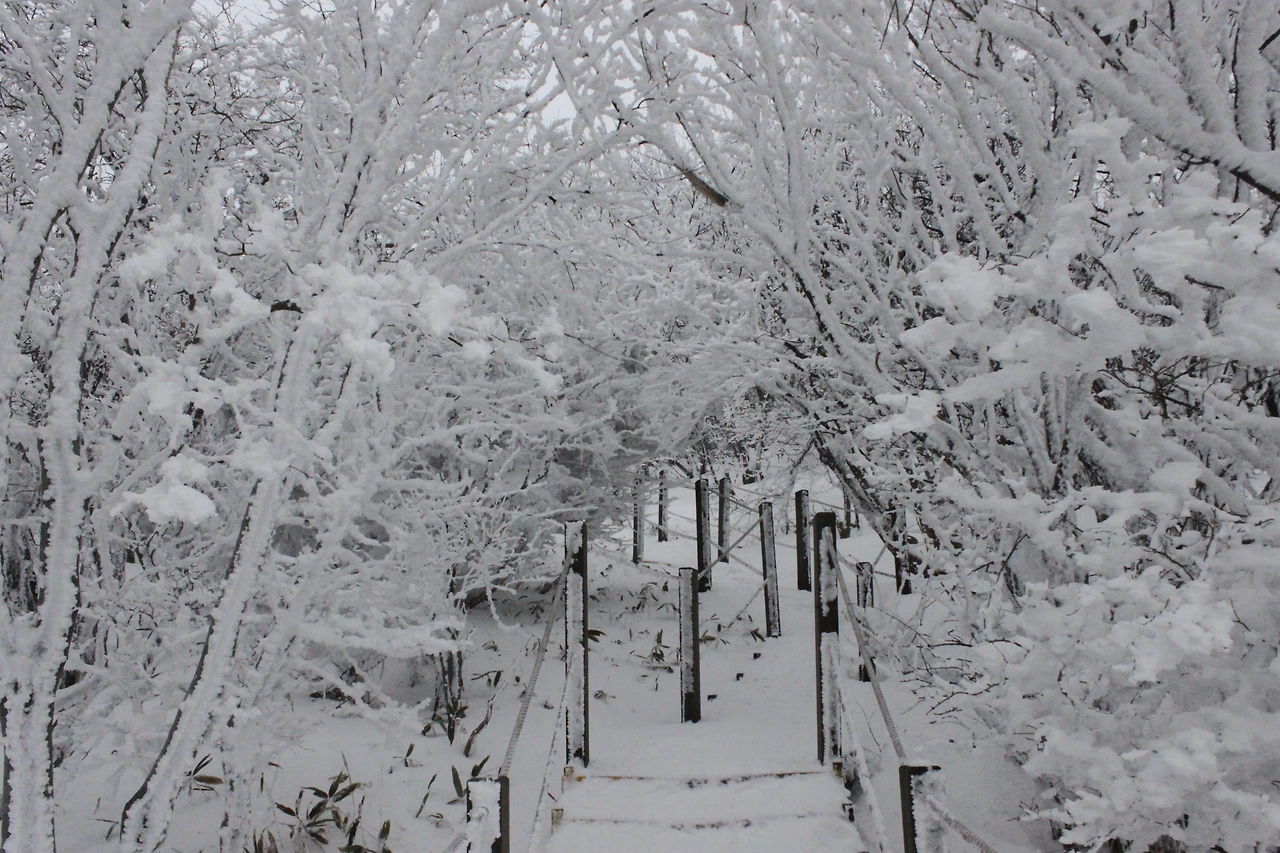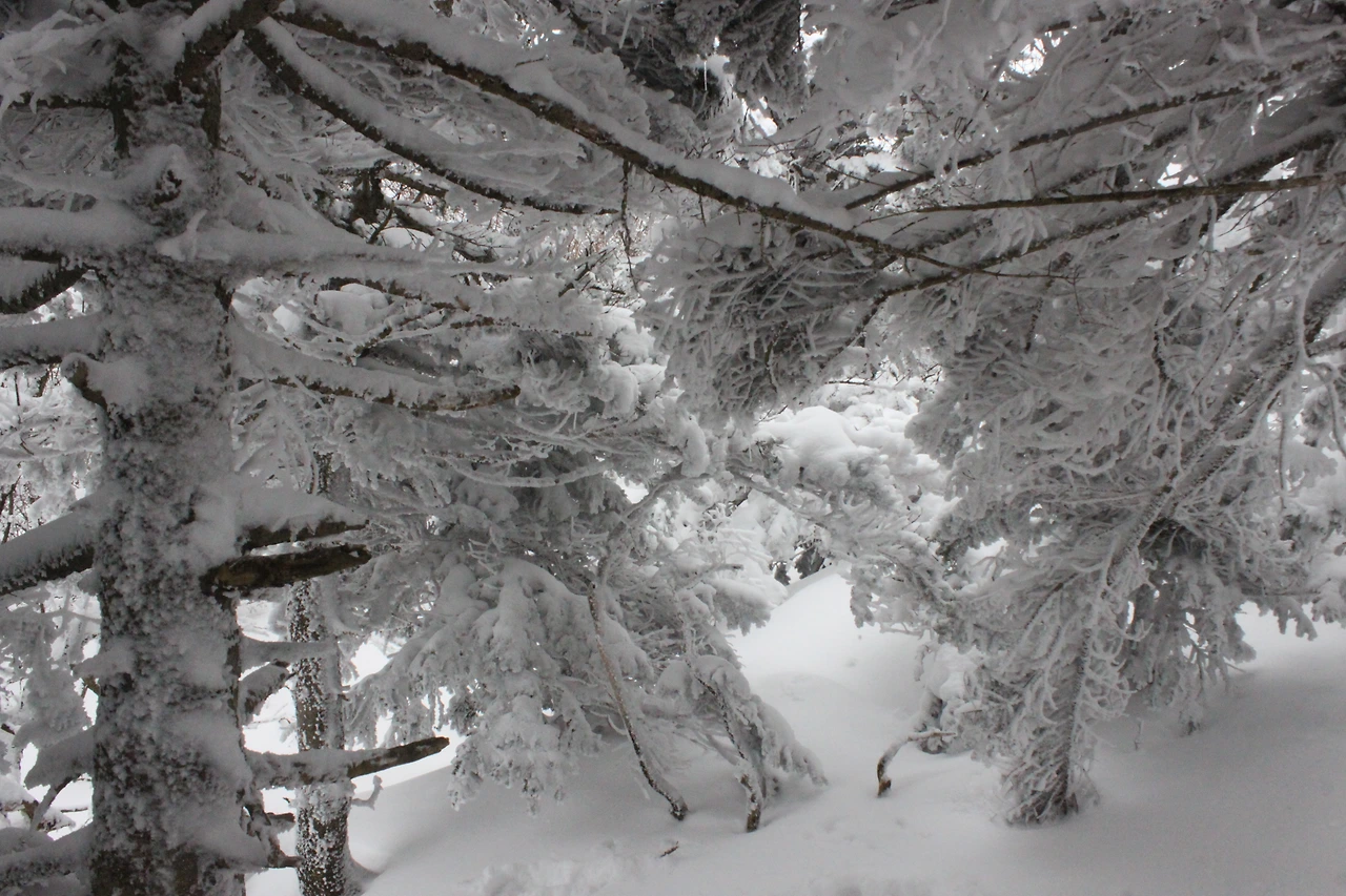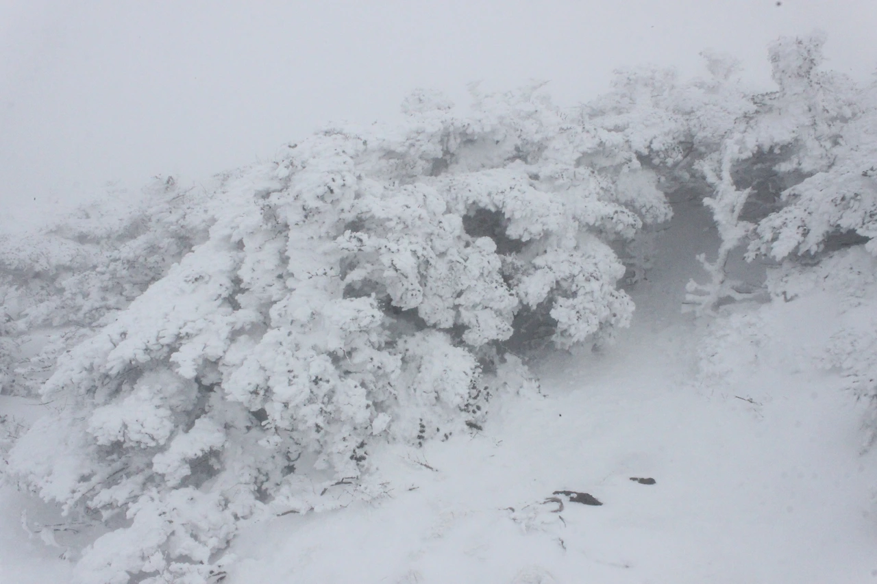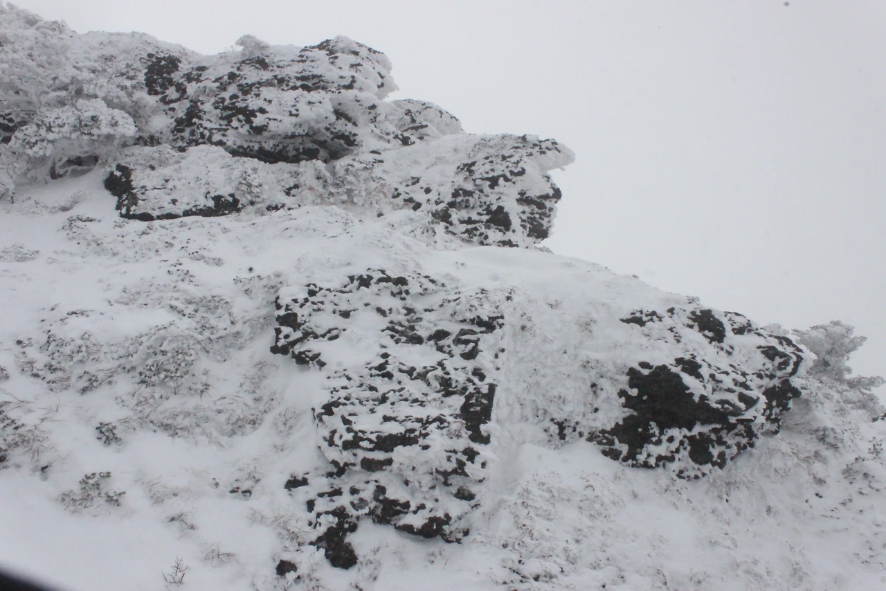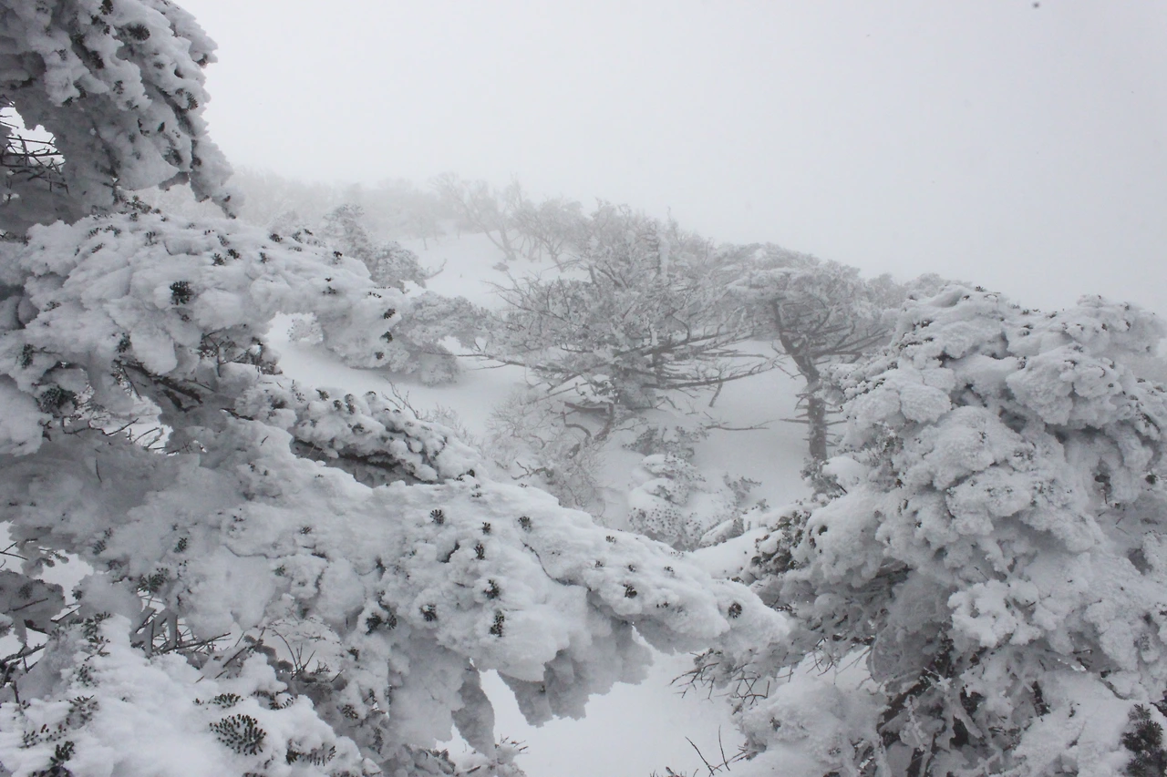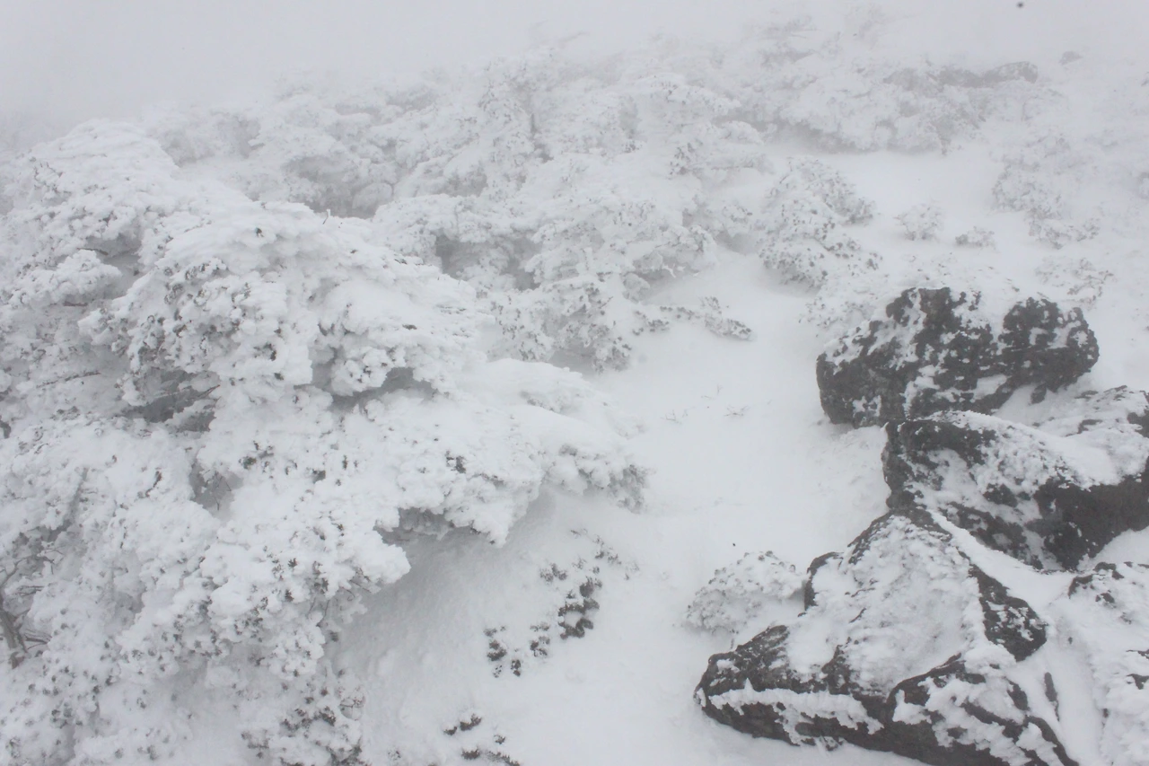 대피소를 통과해 경사가 점점 심해지는 길을 올라가다 보니 나무에 눈꽃이 마치 뼈대를 이룬 집처럼 그 하얀 속 뼈대들은 보여주어 마치 은은하고 찬란한 후광처럼 빛을 발한다.