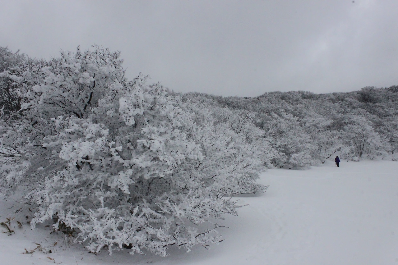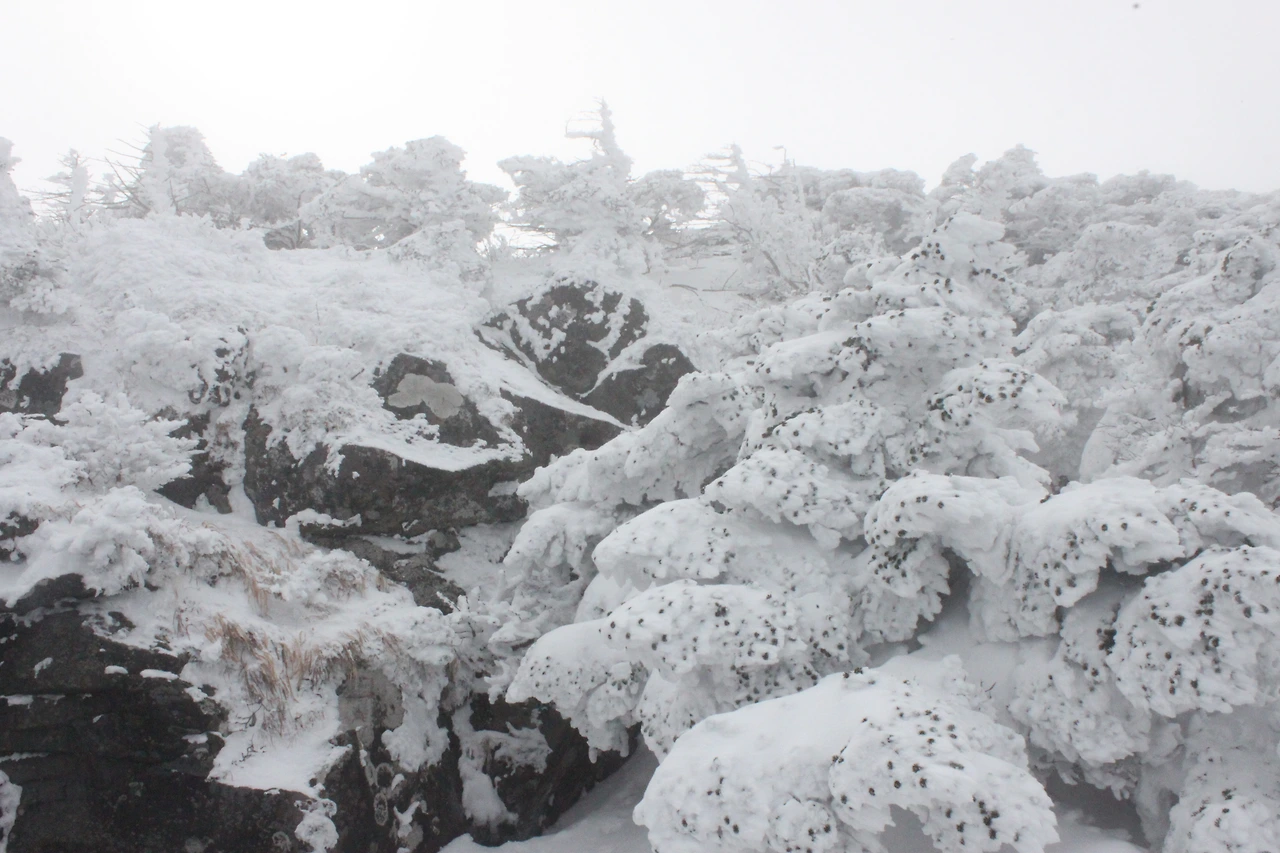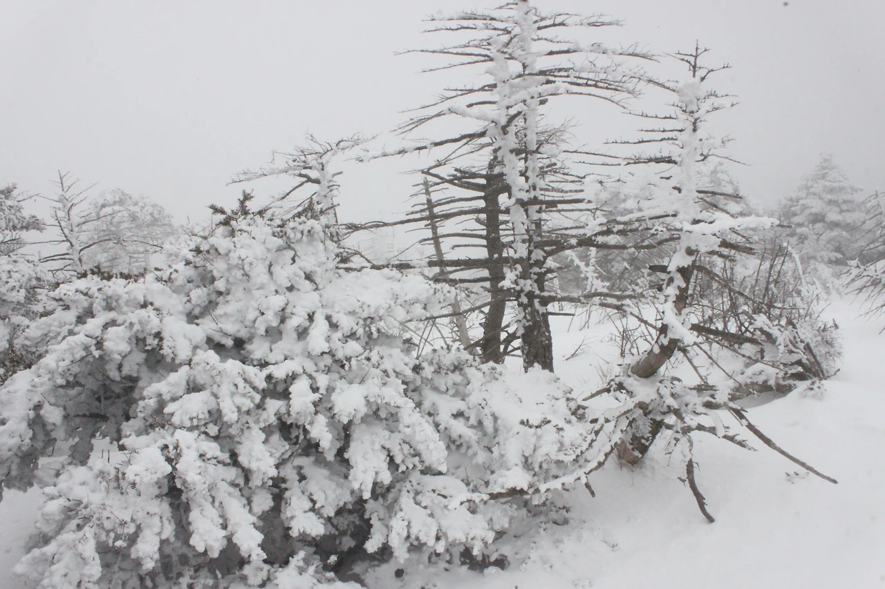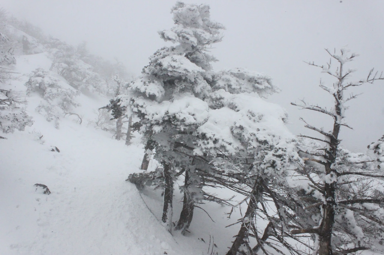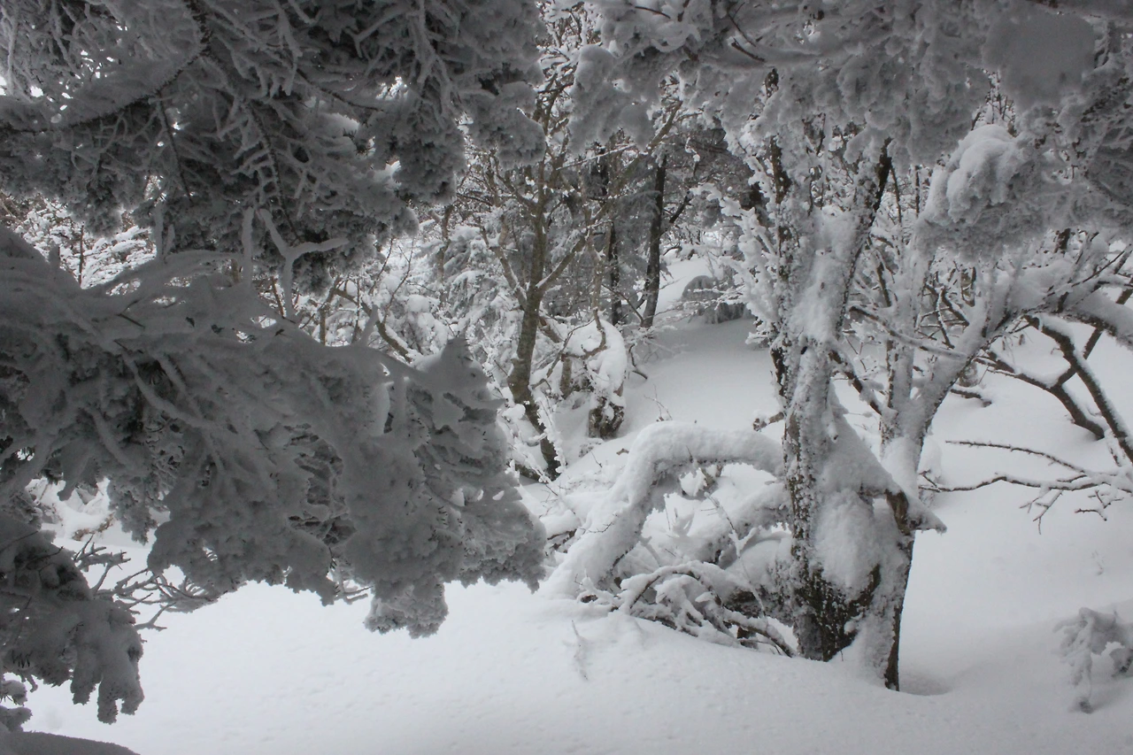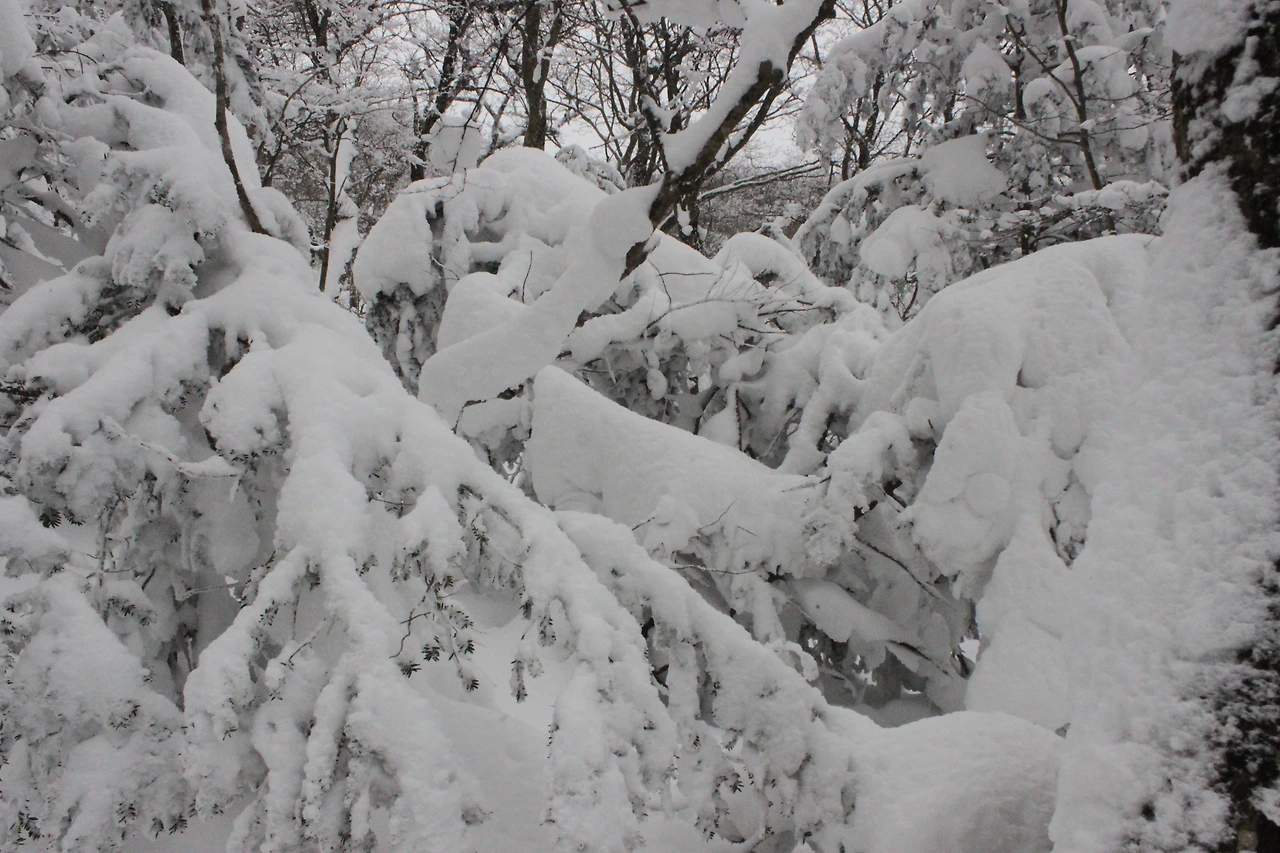 대피소를 통과해 경사가 점점 심해지는 길을 올라가다 보니 나무에 눈꽃이 마치 뼈대를 이룬 집처럼 그 하얀 속 뼈대들은 보여주어 마치 은은하고 찬란한 후광처럼 빛을 발한다.